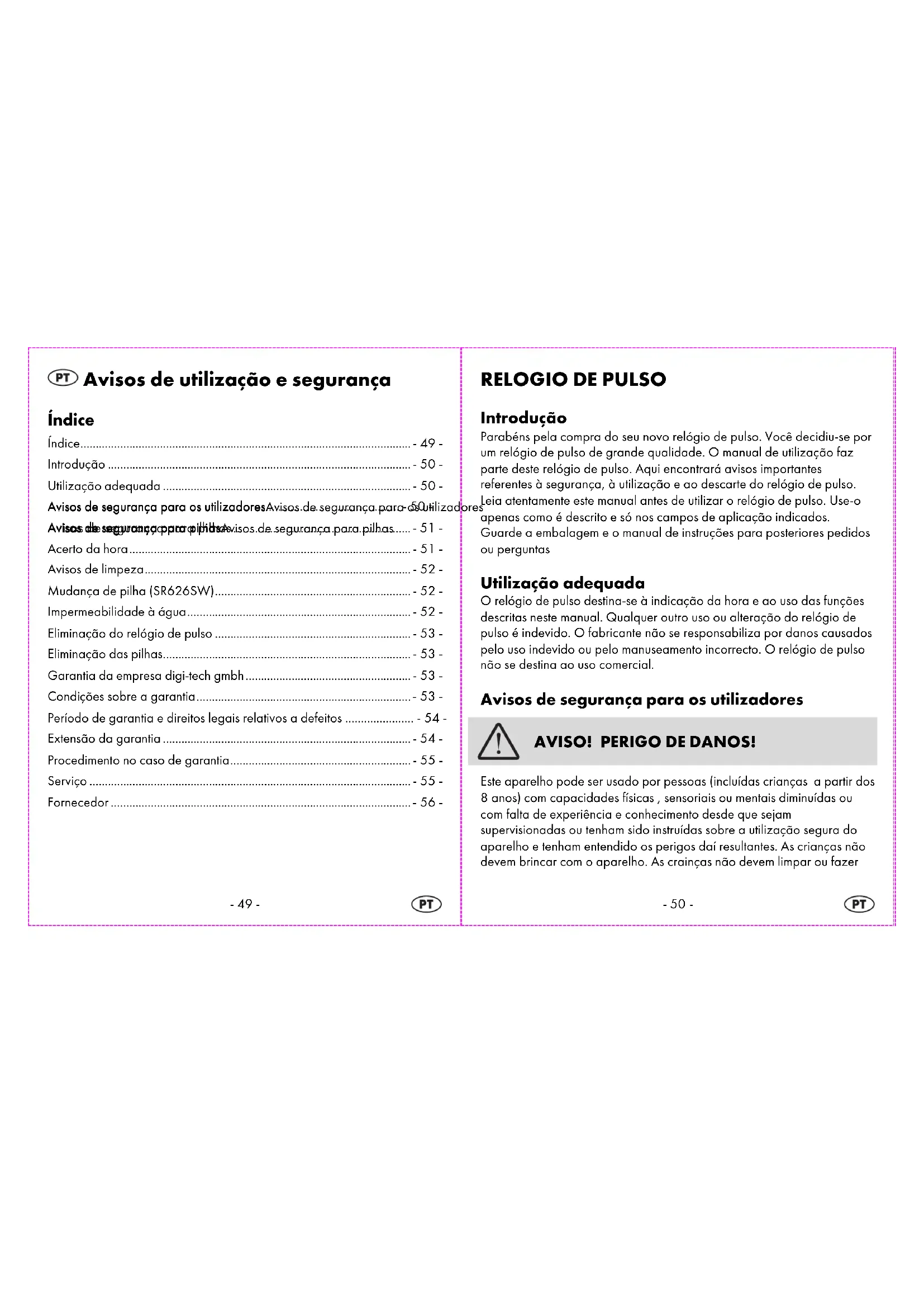 Avisos de utilização e segurança Índice Índice ............................................................................................................ - 49 - Introdução ................................................................................................... - 50 - Utilização adequada ................................................................................. - 50 - Avisos de segurança para os utilizadores Avisos de segurança para os utilizadoresAvisos de segurança para os utilizadores Avisos de segurança para os utilizadores........................................... - 50 - Avisos de segurança para pilhas Avisos de segurança para pilhasAvisos de segurança para pilhas Avisos de segurança para pilhas .......................................................... - 51 - Acerto da hora ............................................................................................ - 51 - Avisos de limpeza ....................................................................................... - 52 - Mudança de pilha (SR626SW) ................................................................ - 52 - Impermeabilidade à água ......................................................................... - 52 - Eliminação do relógio de pulso ................................................................ - 53 - Eliminação das pilhas ................................................................................. - 53 - Garantia da empresa digi-tech gmbh ...................................................... - 53 - Condições sobre a garantia ...................................................................... - 53 - Período de garantia e direitos legais relativos a defeitos ...................... - 54 - Extensão da garantia ................................................................................. - 54 - Procedimento no caso de garantia ........................................................... - 55 - Serviço ......................................................................................................... - 55 - Fornecedor .................................................................................................. - 56 -