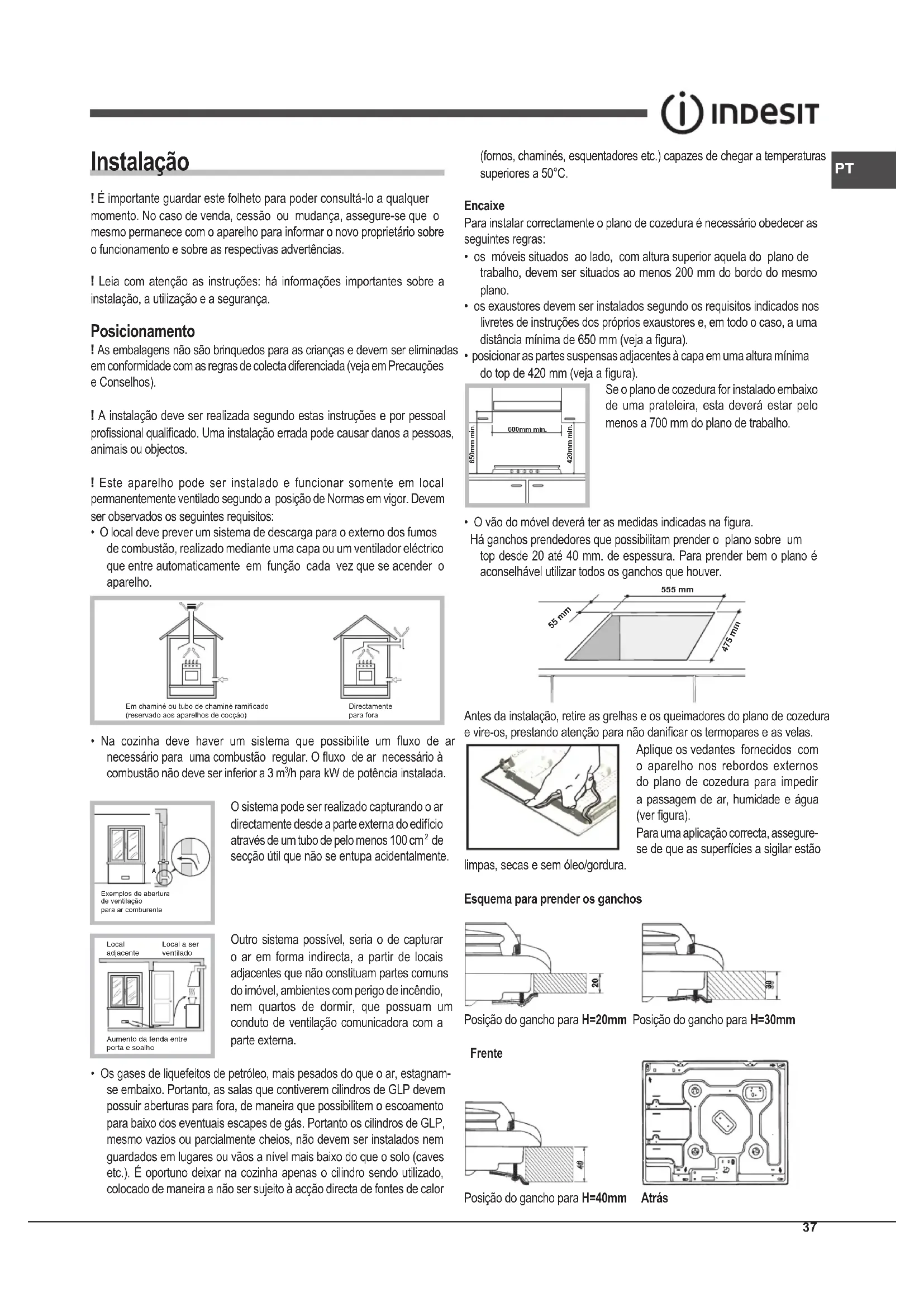Exemplos de abertura de ventilaçãopara ar comburenteAumento da fenda entreporta e soalhoLocaladjacenteLocal a serventilado (fornos, chaminés, esquentadores etc.) capazes de chegar a temperaturas superiores a 50°C. Encaixe Para instalar correctamente o plano de cozedura é necessário obedecer as seguintes regras: