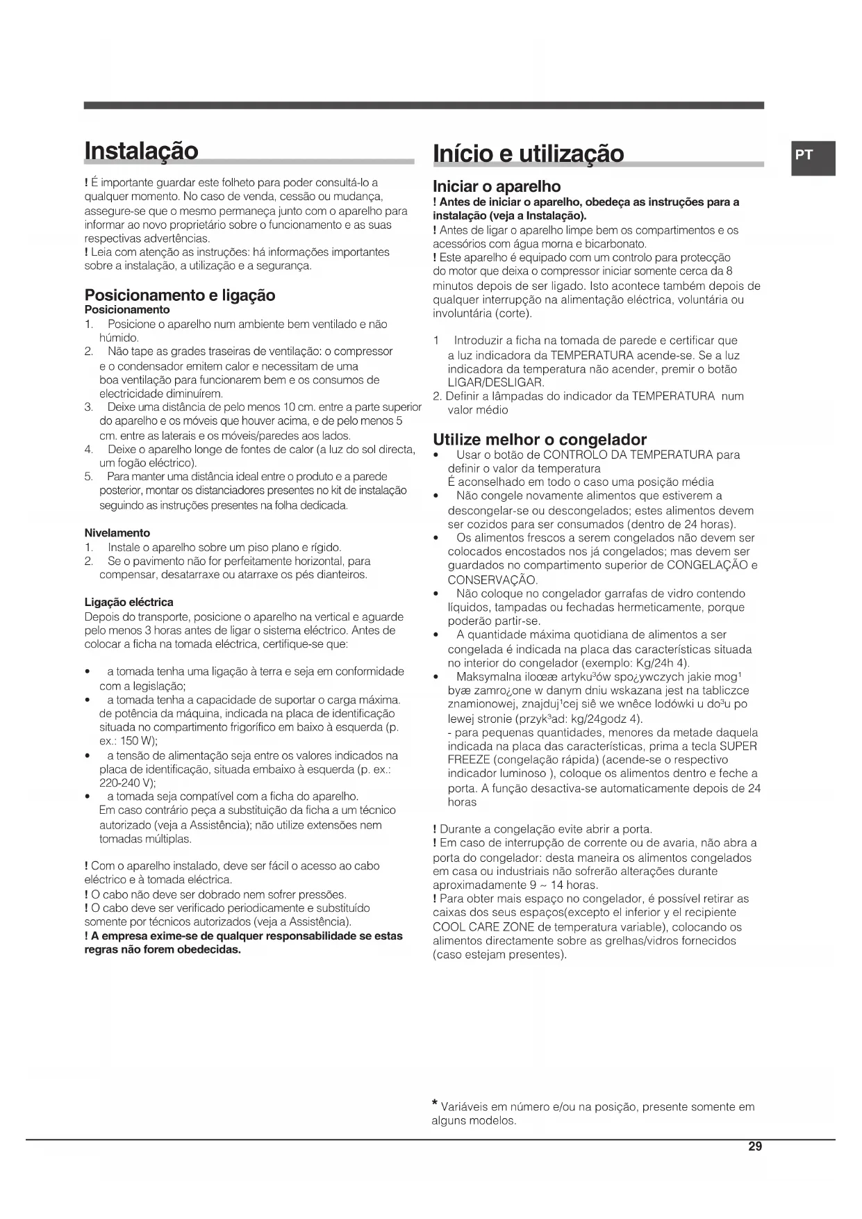 - atomadasejacompatívelcomafichadoaparelho. Emcasocontráriopeçaasubstituiçãodafichaaumtécnico autorizado(vejaaAssistência);nãoutilizeextensõesnem tomadasmúltiplas. !Comoaparelhoinstalado,deveserfáciloacessoaocabo eléctricoeàtomadaeléctrica. !Ocabonãodeveserdobradonemsofrerpressões. !Ocabodeveserverificadoperiodicamenteesubstituído somenteportécnicosautorizados(vejaaAssistência). ! A empresa exime-se de qualquer responsabilidade se estas regras não forem obedecidas. Início e utilização Iniciar o aparelho ! Antes de iniciar o aparelho, obedeça as instruções para a instalação (veja a Instalação). !Antesdeligaroaparelholimpebemoscompartimentoseos acessórioscomáguamornaebicarbonato. !Esteaparelhoéequipadocomumcontroloparaprotecção domotorquedeixaocompressoriniciarsomentecercada8 minutosdepoisdeserligado.Istoacontecetambémdepoisde qualquerinterrupçãonaalimentaçãoeléctrica,voluntáriaou involuntária(corte). 1 Introduzirafichanatomadadeparedeecertificarque aluzindicadoradaTEMPERATURAacende-se.Sealuz indicadoradatemperaturanãoacender,premirobotão LIGAR/DESLIGAR. 2.DefiniralâmpadasdoindicadordaTEMPERATURAnum valormédio Utilize melhor o congelador