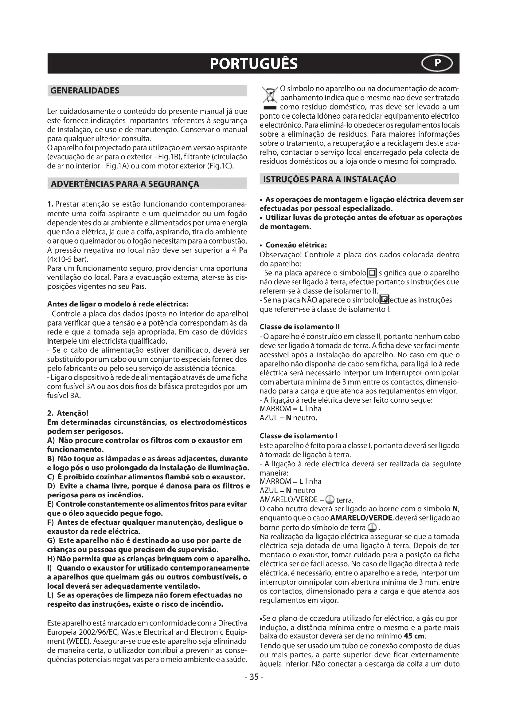 mente uma coifa aspirante e um queimador ou um fogão dependentes do ar ambiente e alimentados por uma energia que não a elétrica, já que a coifa, aspirando, tira do ambiente o ar que o queimador ou o fogão necesitam para a combustão. A pressão negativa no local não deve ser superior a 4 Pa (4x10-5 bar). Para um funcionamento seguro, providenciar uma oportuna ventilação do local. Para a evacuação externa, ater-se às dis- posições vigentes no seu País. Antes de ligar o modelo à rede eléctrica: - Controle a placa dos dados (posta no interior do aparelho) para verificar que a tensão e a potência correspondam às da rede e que a tomada seja apropriada. Em caso de dúvidas interpele um electricista qualificado. - Se o cabo de alimentação estiver danificado, deverá ser substituído por um cabo ou um conjunto especiais fornecidos pelo fabricante ou pelo seu serviço de assistência técnica. - Ligar o dispositivo à rede de alimentação através de uma ficha com fusível 3A ou aos dois fios da bifásica protegidos por um fusível 3A. 2.Atenção! Em determinadas circunstâncias, os electrodomésticos podem ser perigosos. A)Nãoprocurecontrolarosfiltroscomoexaustorem funcionamento. B)Nãotoqueaslâmpadaseasáreasadjacentes,durante elogopósousoprolongadodainstalaçãodeiluminação. C)Éproibidocozinharalimentosflambésoboexaustor. D) Evite a chama livre, porque é danosa para os filtros e perigosa para os incêndios. E) Controle constantemente os alimentos fritos para evitar queoóleoaquecidopeguefogo. F)Antesdeefectuarqualquermanutenção,desligueo exaustordaredeeléctrica. G)Esteaparelhonãoédestinadoaousoporpartede criançasoupessoasqueprecisemdesupervisão. H)Nãopermitaqueascriançasbrinquemcomoaparelho. I)Quandooexaustorforutilizadocontemporaneamente a aparelhos que queimam gás ou outros combustíveis, o local deverá ser adequadamente ventilado. L)Seasoperaçõesdelimpezanãoforemefectuadasno respeitodasinstruções,existeoriscodeincêndio. Este aparelho está marcado em conformidade com a Directiva Europeia 2002/96/EC, Waste Electrical and Electronic Equip- ment (WEEE). Assegurar-se que este aparelho seja eliminado de maneira certa, o utilizador contribui a prevenir as conse- quências potenciais negativas para o meio ambiente e a saúde. PORTUGUÊS P- 36 - pelo qual circule ar quente ou utilizado para evacuar fumos de aparelhos alimentados por uma energia que não a elétrica. Antes de proceder às operações de montagem, para um manejo mais fácil do aparelho retirar os filtros anti-gordura (Fig.2.2 - Fig.3.2). - No caso de montagem do aparelho em versão aspirante predisponha o furo de evacuação do ar.
