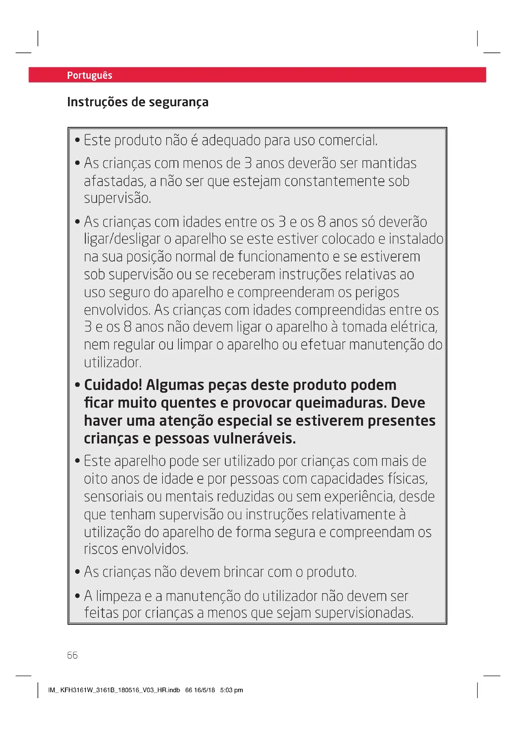 - A limpeza e a manutenção do utilizador não devem ser feitas por crianças a menos que sejam supervisionadas. Instruções de segurança IM_ KFH3161W_3161B_180516_V03_HR.indb 66 16/5/18 5:03 pmPortuguês