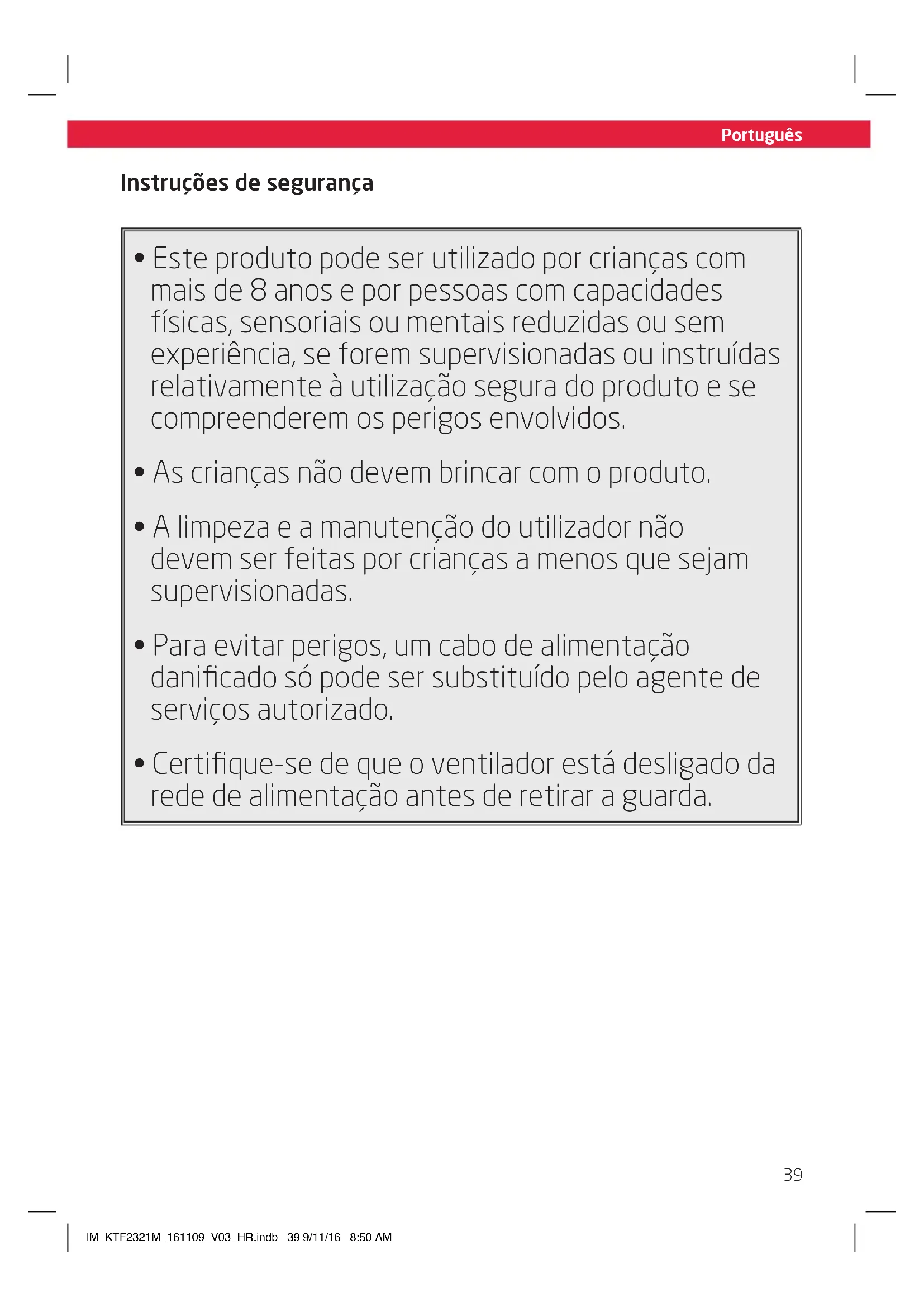 - Certifique-se de que o ventilador está desligado da rede de alimentação antes de retirar a guarda. IM_KTF2321M_161109_V03_HR.indb 39 9/11/16 8:50 AMPortuguês