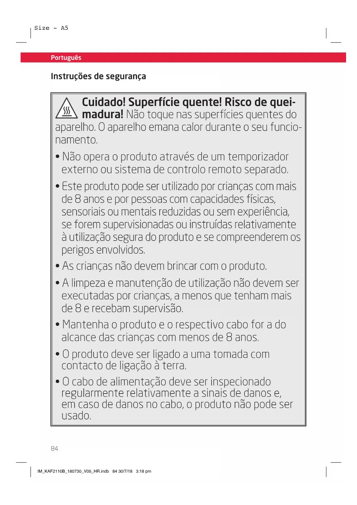 - O cabo de alimentação deve ser inspecionado regularmente relativamente a sinais de danos e, em caso de danos no cabo, o produto não pode ser usado. IM_KAF2110B_180730_V05_HR.indb 84 30/7/18 3:18 pmPortuguês