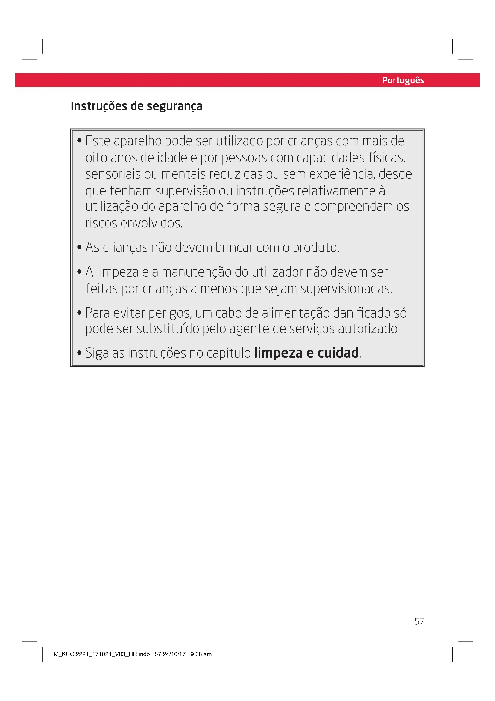 - Este aparelho pode ser utilizado por crianças com mais de oito anos de idade e por pessoas com capacidades físicas, sensoriais ou mentais reduzidas ou sem experiência, desde que tenham supervisão ou instruções relativamente à utilização do aparelho de forma segura e compreendam os riscos envolvidos.