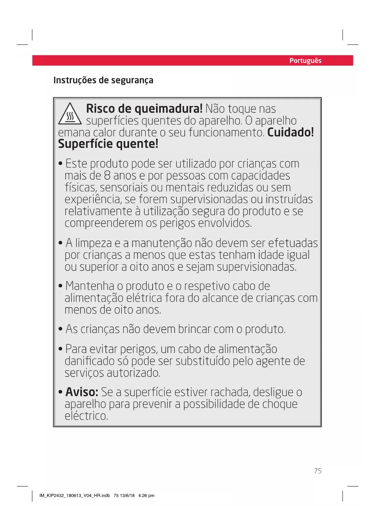 Limpe as superfícies exteriores do aparelho com um pano húmido e, em seguida, sequeas totalmente. Certifique-se de que não se infiltra água no produto (por exemplo, através do interruptor). IM_KIP2432_180613_V04_HR.indb 81 13/6/18 4:26 pmSize - A5