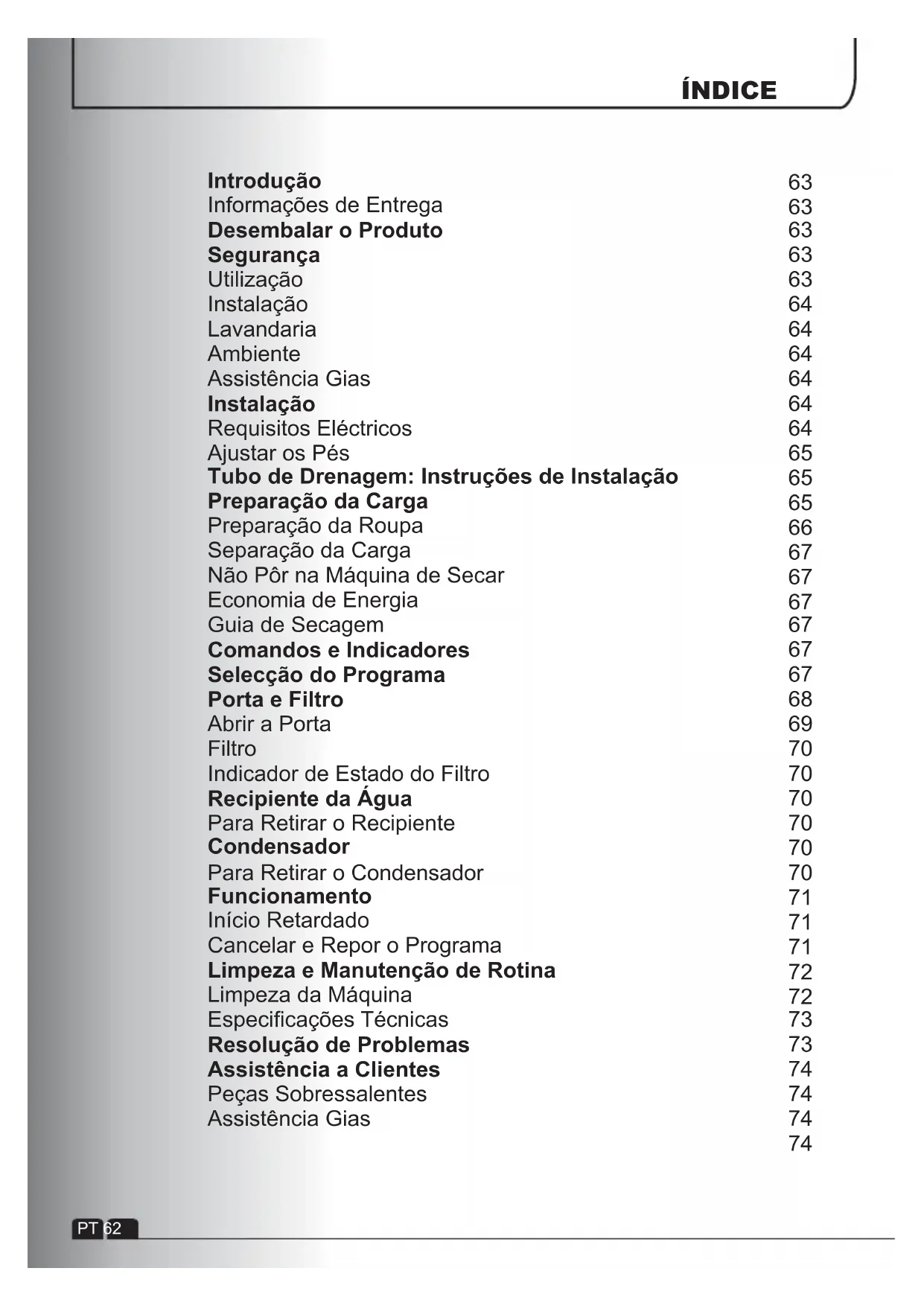 61Introdução Informações de Entrega Desembalar o Produto Segurança Utilização Instalação Lavandaria Ambiente Assistência Gias Instalação Requisitos Eléctricos Ajustar os Pés Tubo de Drenagem: Instruções de Instalação Preparação da Carga Preparação da Roupa Separação da Carga Não Pôr na Máquina de Secar Economia de Energia Guia de Secagem Comandos e Indicadores Selecção do Programa Porta e Filtro Abrir a Porta Filtro Indicador de Estado do Filtro Recipiente da Água Para Retirar o Recipiente Condensador Para Retirar o Condensador Funcionamento Início Retardado Cancelar e Repor o Programa Limpeza e Manutenção de Rotina Limpeza da Máquina Especificações Técnicas Resolução de Problemas Assistência a Clientes Peças Sobressalentes Assistência Gias ÍNDICE PT 62