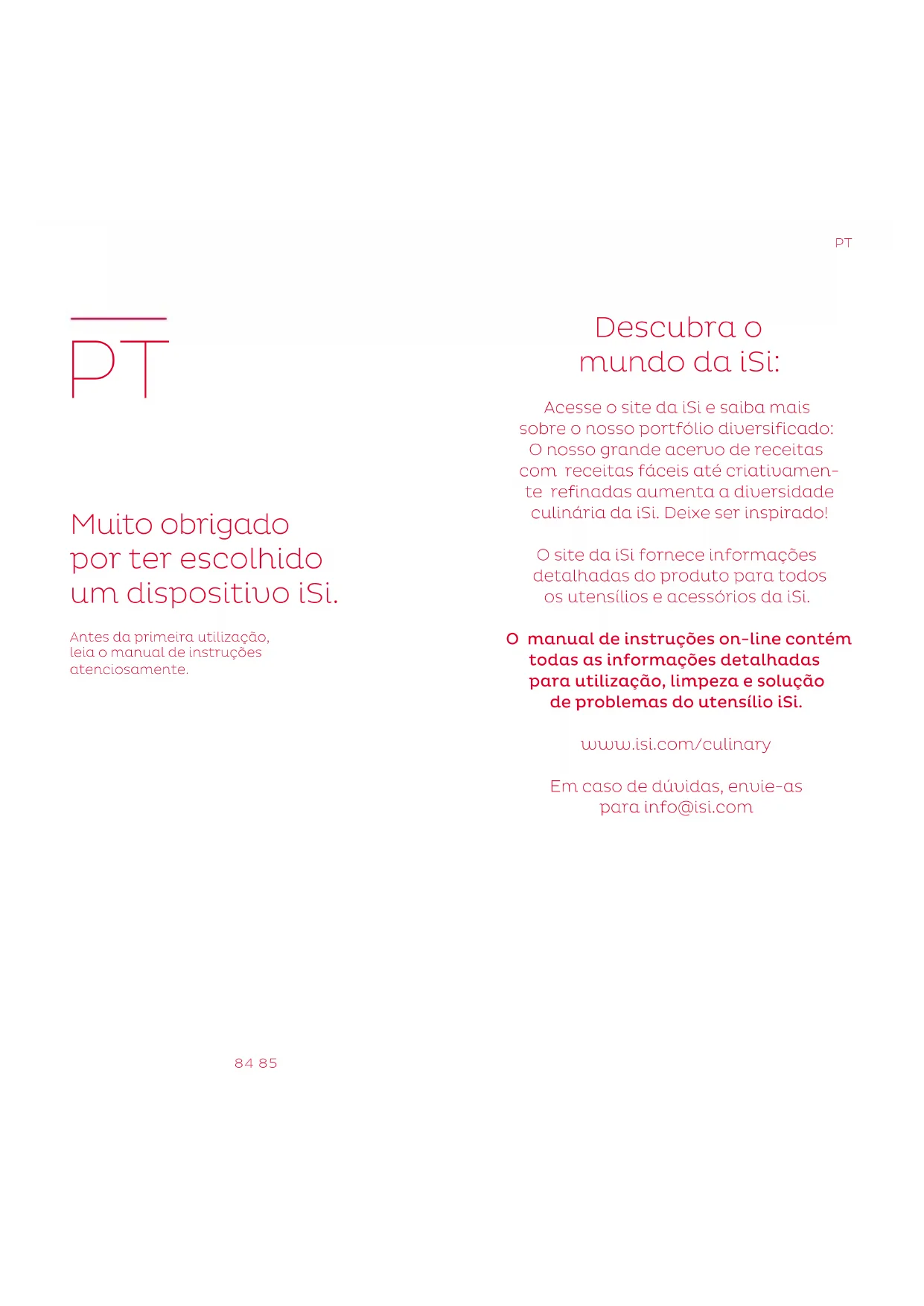 Descubra o mundo da iSi: Acesse o site da iSi e saiba mais sobre o nosso portfólio diversificado: O nosso grande acervo de receitas com receitas fáceis até criativamen- te refinadas aumenta a diversidade culinária da iSi. Deixe ser inspirado! O site da iSi fornece informações detalhadas do produto para todos os utensílios e acessórios da iSi. O manual de instruções on-line contém todas as informações detalhadas para utilização, limpeza e solução de problemas do utensílio iSi. www.isi.com/culinary Em caso de dúvidas, envie-as para info@isi.com86 87 Qualidade garantida: Todos os utensílios da iSi foram verificados detalhadamente antes sair da fábrica. A iSi possui uma garantia de 2 anos contra defeitos do material e da fabricação, desde que o dano não tenha surgido devido à utilização indevida. A garantia vale a partir da data do recibo da compra. Faça agora o seu registro on-line e ampliaremos a sua garantia! Aproveite os benefícios: Garantia de 3 anos con- tra defeitos do material e da fabricação, assim como garantir de 5 anos para o isolamento da garrafa Thermo. A garantia vale somente na utilização de peças iSi originais do dispositivo, de acordo com a lista dos componentes do produto. O funcionamento perfeito do dispositivo só é garantido se forem utilizadas somente cápsulas iSi. Não podem ser realizadas reivindicações de garantia ou de responsabilidade em caso de erros, defeitos ou danos resultantes principalmente do não comprimento e/ou da não leitura do manual de instruções e das respectivas instruções de segurança. Basta acessar e garantir os benefícios: www.isi.com/garantida