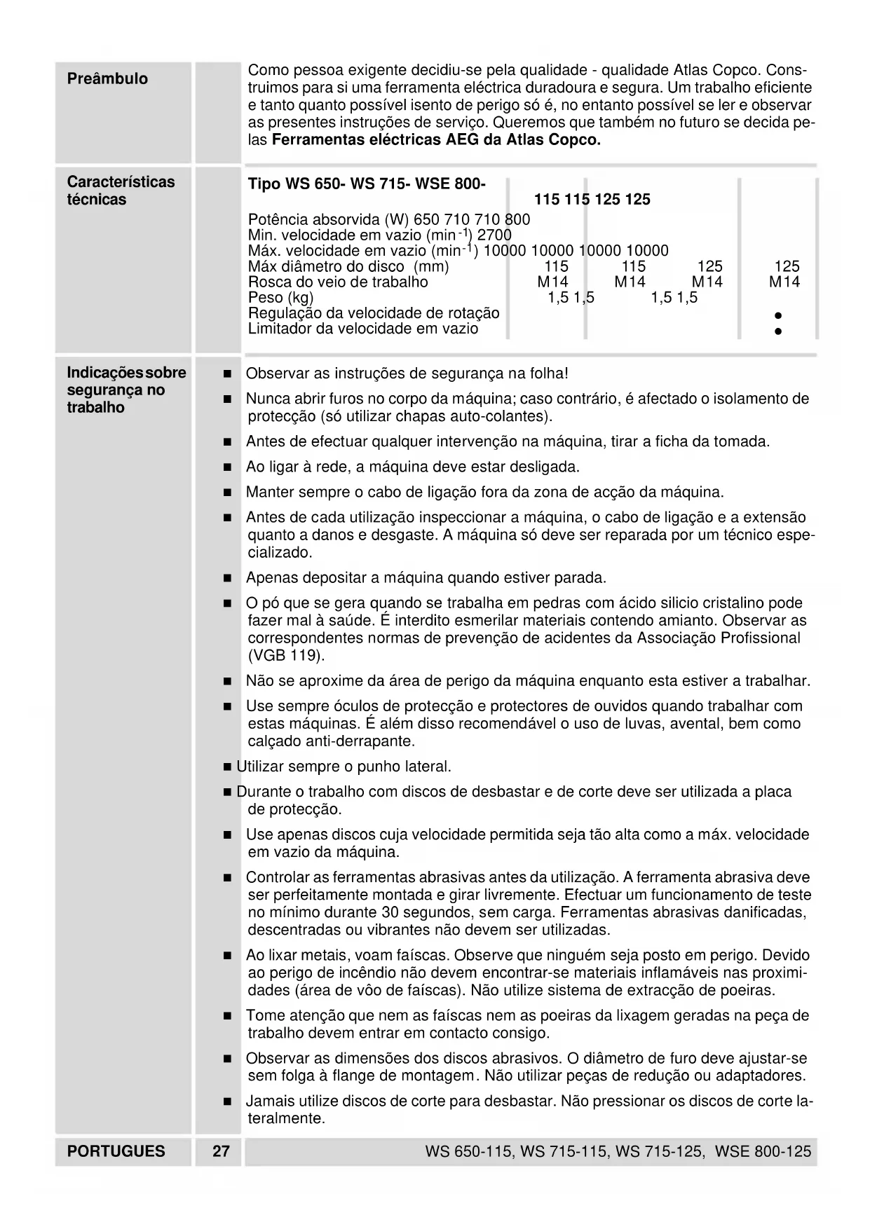 Asegúrese de que el aro de la tuerca de apriete FIXTEC de fijación rápida esté si- tuado hacia arriba para el apriete/aflojado. Tuerca de apriete Afloje y apriete respectivamente la tuerca de apriete con una llave de dos pivotes.ESPAÑOL 26 WS 650-115, WS 715-115, WS 715-125, WSE 800-125 Sugerencias para trabajar Cuando esmerile, no aplique presión sobre la herramienta. Utilícela con unos mo- vimientos alternativos suaves. Desbasto en bruto Para obtener los mejores resultados en el desbastado en bruto, mantenga el disco en un ángulo de 30° como mínimo con la superficie de trabajo. Si se sobrecarga la máquina durante el amolado, se dañará y se producirá un des- gaste más rápido de los discos. También disminuirá la capacidad de amolado. No usar jamás discos tronzadores para desbastar. No someter los discos tronzado- res con una presión lateral. Corte No incline la amoladora angular cuando corte. El disco de corte debe tener un borde limpio. ¡Cuando corte piedra deberá usar el patín de guía! Lijado de superficies En el lijado de superficies, utilice un plato de plástico con un disco de papel de lija. Para eliminar herrumbre o capas antiguas de pintura, se recomienda usar un cepillo de acero (en forma de copa). Servicio Mantener siempre limpias las ventanas de refrigeración. Solo se deben utilizar accesorios y piezas de repuestos AEG. Piezas cuyo recambio no está descrito en las instrucciones de uso, deben sustituirse en un centro de asis- tencia técnica AEG (Consulte el folleto Garantia/Direcciones de Centros de Asis- tencia Técnica). En caso necesario, puede solicitar un despiece de la herramienta. Por favor indique el número de impreso de diez dígitos así como el tipo de máquina impreso en la eti- queta y pida el despiece a su centro de asistencia técnica o directamente a: Atlas Copco Electric Tools GmbH, Postfach 320, D 71361 Winnenden. Accesorios Por favor consulte en la página 2-3 la gama de accesorios. En nuestros catálogos encontrará más accesorios con sus números de referencia.PORTUGUES 27 WS 650-115, WS 715-115, WS 715-125, WSE 800-125 Preâmbulo Como pessoa exigente decidiu-se pela qualidade - qualidade Atlas Copco. Cons- truimos para si uma ferramenta eléctrica duradoura e segura. Um trabalho eficiente e tanto quanto possível isento de perigo só é, no entanto possível se ler e observar as presentes instruções de serviço. Queremos que também no futuro se decida pe- las Ferramentas eléctricas AEG da Atlas Copco. Características técnicas Indicações sobre segurança no trabalho ■ Observar as instruções de segurança na folha! ■ Nunca abrir furos no corpo da máquina; caso contrário, é afectado o isolamento de protecção (só utilizar chapas auto-colantes). ■ Antes de efectuar qualquer intervenção na máquina, tirar a ficha da tomada. ■ Ao ligar à rede, a máquina deve estar desligada. ■ Manter sempre o cabo de ligação fora da zona de acção da máquina. ■ Antes de cada utilização inspeccionar a máquina, o cabo de ligação e a extensão quanto a danos e desgaste. A máquina só deve ser reparada por um técnico espe- cializado. ■ Apenas depositar a máquina quando estiver parada. ■ O pó que se gera quando se trabalha em pedras com ácido silicio cristalino pode fazer mal à saúde. É interdito esmerilar materiais contendo amianto. Observar as correspondentes normas de prevenção de acidentes da Associação Profissional (VGB 119). ■ Não se aproxime da área de perigo da máquina enquanto esta estiver a trabalhar. ■ Use sempre óculos de protecção e protectores de ouvidos quando trabalhar com estas máquinas. É além disso recomendável o uso de luvas, avental, bem como calçado anti-derrapante. ■ Utilizar sempre o punho lateral. ■ Durante o trabalho com discos de desbastar e de corte deve ser utilizada a placa de protecção. ■ Use apenas discos cuja velocidade permitida seja tão alta como a máx. velocidade em vazio da máquina. ■ Controlar as ferramentas abrasivas antes da utilização. A ferramenta abrasiva deve ser perfeitamente montada e girar livremente. Efectuar um funcionamento de teste no mínimo durante 30 segundos, sem carga. Ferramentas abrasivas danificadas, descentradas ou vibrantes não devem ser utilizadas. ■ Ao lixar metais, voam faíscas. Observe que ninguém seja posto em perigo. Devido ao perigo de incêndio não devem encontrar-se materiais inflamáveis nas proximi- dades (área de vôo de faíscas). Não utilize sistema de extracção de poeiras. ■ Tome atenção que nem as faíscas nem as poeiras da lixagem geradas na peça de trabalho devem entrar em contacto consigo. ■ Observar as dimensões dos discos abrasivos. O diâmetro de furo deve ajustar-se sem folga à flange de montagem. Não utilizar peças de redução ou adaptadores. ■ Jamais utilize discos de corte para desbastar. Não pressionar os discos de corte la- teralmente. Tipo WS 650- WS 715- WSE 800-