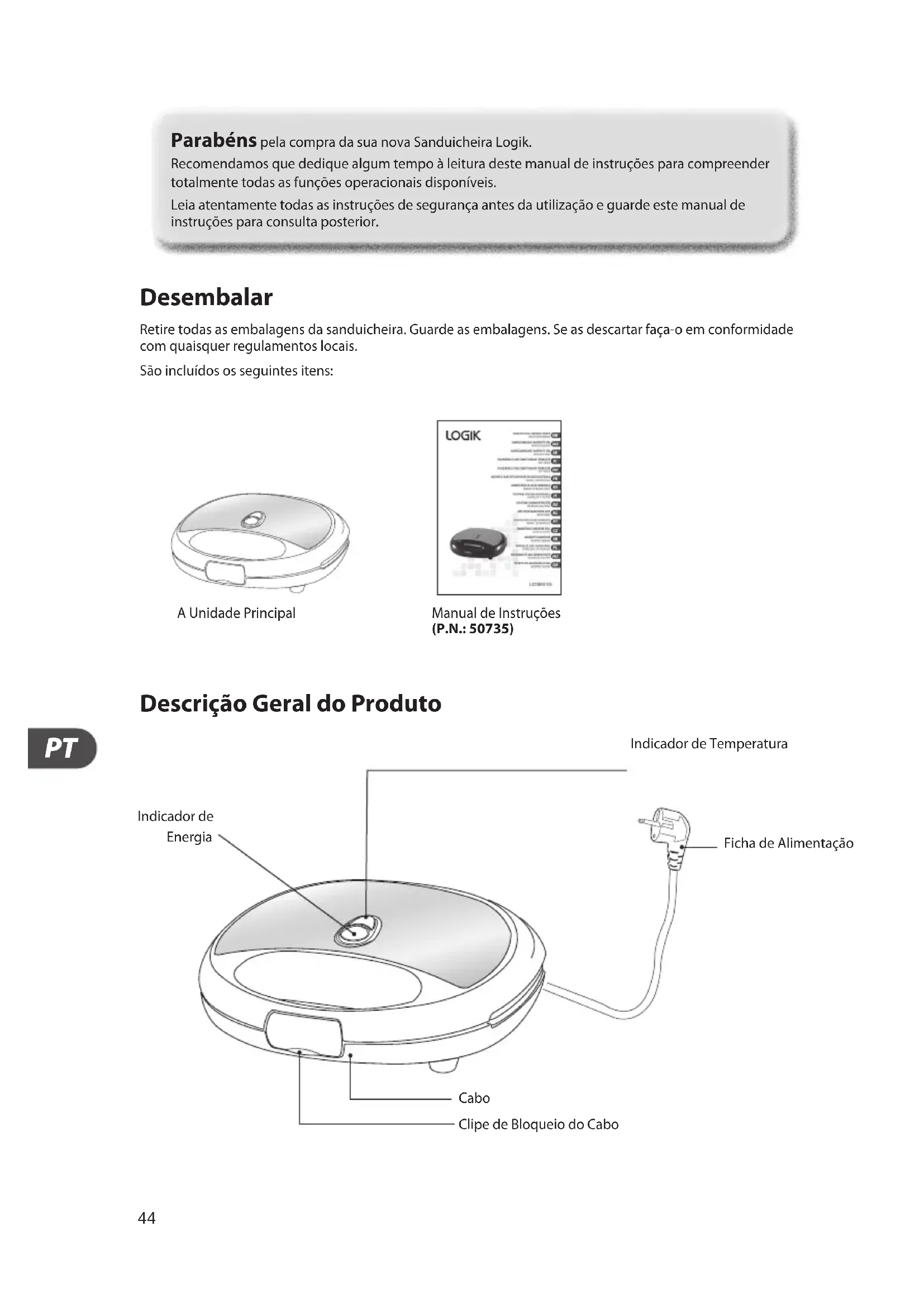 Desembalar Retire todas as embalagens da sanduicheira. Guarde as embalagens. Se as descartar faça-o em conformidade com quaisquer regulamentos locais. São incluídos os seguintes itens: Manual de Instruções (P.N.: 50735) A Unidade Principal Descrição Geral do Produto Ficha de Alimentação Indicador de Energia Cabo ClipedeBloqueiodoCabo Indicador de Temperatura Parabéns pela compra da sua nova Sanduicheira Logik. Recomendamos que dedique algum tempo à leitura deste manual de instruções para compreender totalmente todas as funções operacionais disponíveis. Leia atentamente todas as instruções de segurança antes da utilização e guarde este manual de instruções para consulta posterior.45