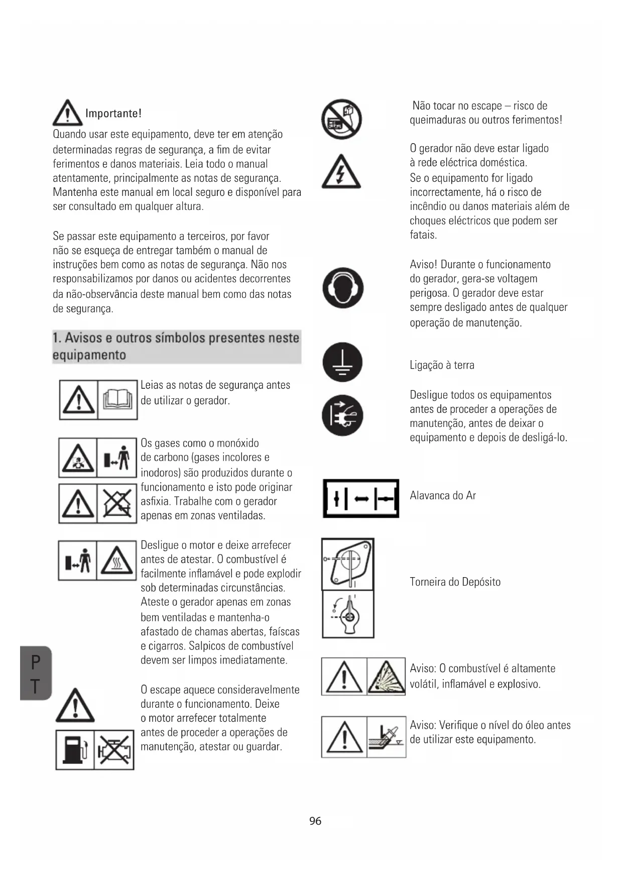 equipamento Leias as notas de segurança antes de utilizar o gerador. Os gases como o monóxido de carbono (gases incolores e inodoros) são produzidos durante o funcionamento e isto pode originar asfixia. Trabalhe com o gerador apenas em zonas ventiladas. Desligue o motor e deixe arrefecer antes de atestar. O combustível é facilmente inflamável e pode explodir sob determinadas circunstâncias. Ateste o gerador apenas em zonas bem ventiladas e mantenha-o afastado de chamas abertas, faíscas e cigarros. Salpicos de combustível devem ser limpos imediatamente. O escape aquece consideravelmente durante o funcionamento. Deixe o motor arrefecer totalmente antes de proceder a operações de manutenção, atestar ou guardar.