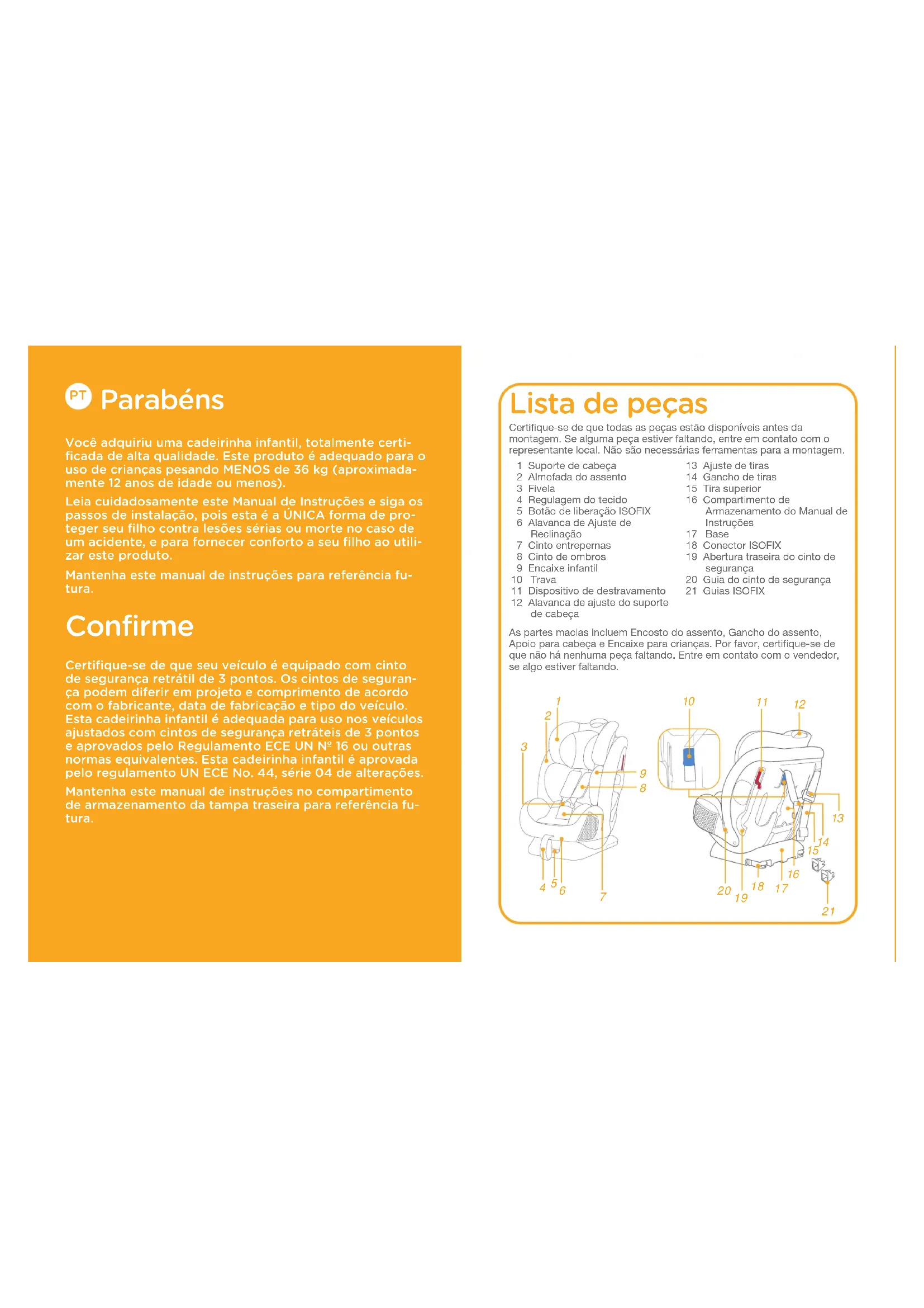 Parabéns Você adquiriu uma cadeirinha infantil﹐ totalmente certi- ficada de alta qualidade. Este produto é adequado para o uso de crianças pesando MENOS de 36 kg (aproximada- mente 12 anos de idade ou menos). Leia cuidadosamente este Manual de Instruções e siga os passos de instalação﹐ pois esta é a ÚNICA forma de pro- teger seu filho contra lesões sérias ou morte no caso de um acidente﹐ e para fornecer conforto a seu filho ao utili- zar este produto. Mantenha este manual de instruções para referência fu- tura. Confirme Certifique-se de que seu veículo é equipado com cinto de segurança retrátil de 3 pontos. Os cintos de seguran- ça podem diferir em projeto e comprimento de acordo com o fabricante﹐ data de fabricação e tipo do veículo. Esta cadeirinha infantil é adequada para uso nos veículos ajustados com cintos de segurança retráteis de 3 pontos e aprovados pelo Regulamento ECE UN Nº 16 ou outras normas equivalentes. Esta cadeirinha infantil é aprovada pelo regulamento UN ECE No. 44﹐ série 04 de alterações. Mantenha este manual de instruções no compartimento de armazenamento da tampa traseira para referência fu- tura. Lista de peças Certifique-se de que todas as peças estão disponíveis antes da montagem. Se alguma peça estiver faltando, entre em contato com o representante local. Não são necessárias ferramentas para a montagem.As partes macias incluem Encosto do assento, Gancho do assento, Apoio para cabeça e Encaixe para crianças. Por favor, certifique-se de que não há nenhuma peça faltando. Entre em contato com o vendedor, se algo estiver faltando. 1 Suporte de cabeça 2 Almofada do assento 3 Fivela 4 Regulagem do tecido 5 Botão de liberação ISOFIX 6 Alavanca de Ajuste de Reclinação 7 Cinto entrepernas 8 Cinto de ombros 9 Encaixe infantil 10 Trava 11 Dispositivo de destravamento12 Alavanca de ajuste do suporte de cabeça13 Ajuste de tiras 14 Gancho de tiras 15 Tira superior 16 Compartimento de Armazenamento do Manual de Instruções 17 Base 18 Conector ISOFIX 19 Abertura traseira do cinto de segurança 20 Guia do cinto de segurança 21 Guias ISOFIX