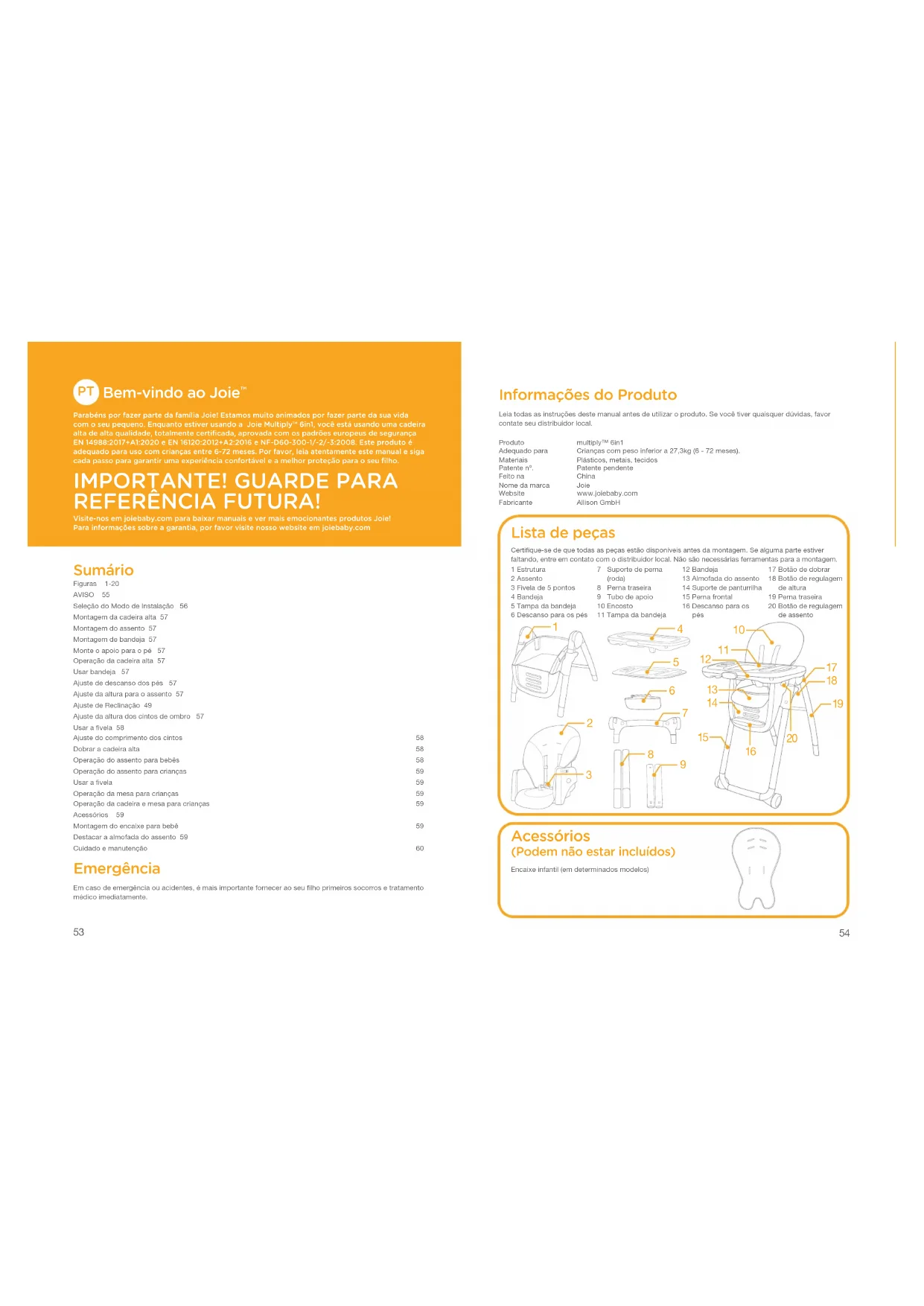 REFERÊNCIA FUTURA! Visite-nos em joiebaby.com para baixar manuais e ver mais emocionantes produtos Joie!Para informações sobre a garantia, por favor visite nosso website em joiebaby.com Sumário Figuras 1-20AVISO 55Seleção do Modo de Instalação 56Montagem da cadeira alta 57Montagem do assento 57Montagem de bandeja 57Monte o apoio para o pé 57Operação da cadeira alta 57Usar bandeja 57Ajuste de descanso dos pés 57Ajuste da altura para o assento 57Ajuste de Reclinação 49Ajuste da altura dos cintos de ombro 57Usar a fivela 58Ajuste do comprimento dos cintos 58Dobrar a cadeira alta 58Operação do assento para bebês 58Operação do assento para crianças 59Usar a fivela 59Operação da mesa para crianças 59Operação da cadeira e mesa para crianças 59Acessórios 59Montagem do encaixe para bebê 59Destacar a almofada do assento 59Cuidado e manutenção 60 Emergência Em caso de emergência ou acidentes, é mais importante fornecer ao seu filho primeiros socorros e tratamento médico imediatamente. Informações do Produto Leia todas as instruções deste manual antes de utilizar o produto. Se você tiver quaisquer dúvidas, favor contate seu distribuidor local.Produto multiply™ 6in1Adequado para Crianças com peso inferior a 27,3kg (6 - 72 meses).Materiais Plásticos, metais, tecidosPatente nº. Patente pendenteFeito na ChinaNome da marca JoieWebsite www.joiebaby.comFabricante Allison GmbH Acessórios (Podem não estar incluídos) Encaixe infantil (em determinados modelos) Lista de peças Certifique-se de que todas as peças estão disponíveis antes da montagem. Se alguma parte estiver faltando, entre em contato com o distribuidor local. Não são necessárias ferramentas para a montagem.