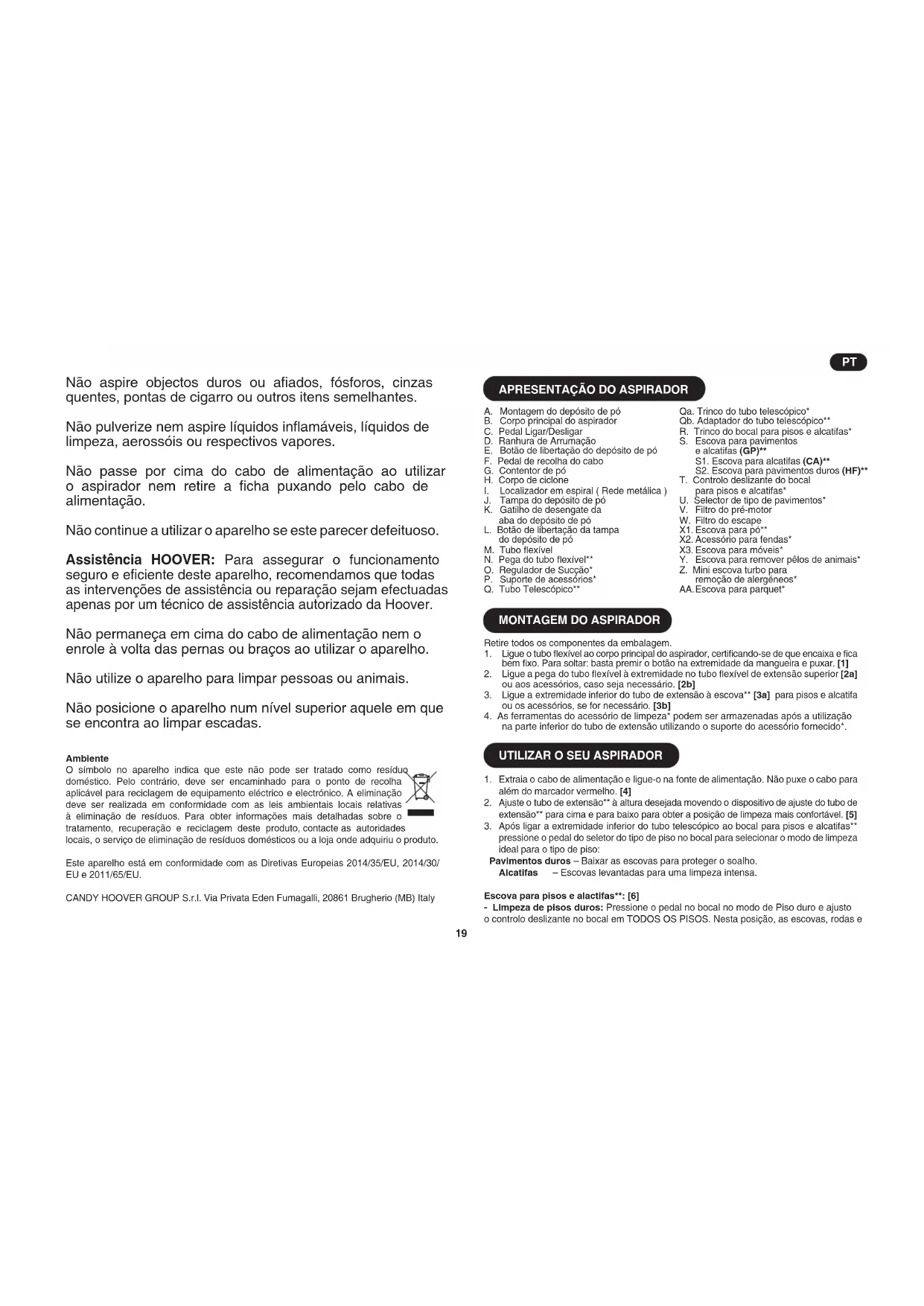 Não aspire objectos duros ou aados, fósforos, cinzas quentes, pontas de cigarro ou outros itens semelhantes. Não pulverize nem aspire líquidos inamáveis, líquidos de limpeza, aerossóis ou respectivos vapores. Não passe por cima do cabo de alimentação ao utilizar o aspirador nem retire a cha puxando pelo cabo de alimentação. Não continue a utilizar o aparelho se este parecer defeituoso. Assistência HOOVER: Para assegurar o funcionamento seguro e eciente deste aparelho, recomendamos que todas as intervenções de assistência ou reparação sejam efectuadas apenas por um técnico de assistência autorizado da Hoover. Não permaneça em cima do cabo de alimentação nem o enrole à volta das pernas ou braços ao utilizar o aparelho. Não utilize o aparelho para limpar pessoas ou animais. Não posicione o aparelho num nível superior aquele em que se encontra ao limpar escadas. Ambiente O símbolo no aparelho indica que este não pode ser tratado como resíduo doméstico. Pelo contrário, deve ser encaminhado para o ponto de recolha aplicável para reciclagem de equipamento eléctrico e electrónico. A eliminação deve ser realizada em conformidade com as leis ambientais locais relativas à eliminação de resíduos. Para obter informações mais detalhadas sobre o tratamento, recuperação e reciclagem deste produto, contacte as autoridades locais, o serviço de eliminação de resíduos domésticos ou a loja onde adquiriu o produto. Este aparelho está em conformidade com as Diretivas Europeias 2014/35/EU, 2014/30/ EU e 2011/65/EU. CANDY HOOVER GROUP S.r.l. Via Privata Eden Fumagalli, 20861 Brugherio (MB) Italy