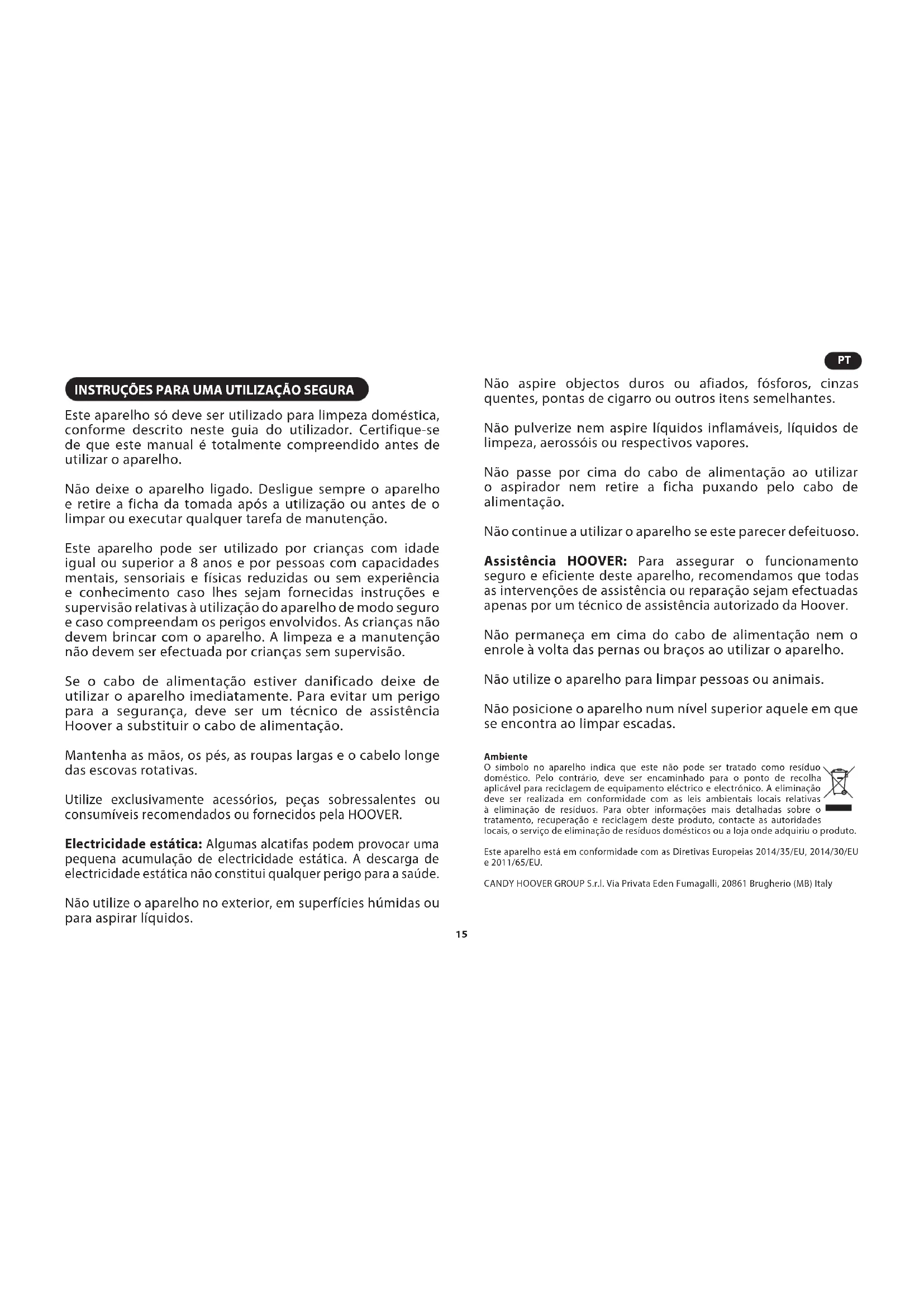 - L’aspirapolvere si è surriscaldato? In questo caso, il reset automatico richiede circa 30 minuti.15 INSTRUÇÕES PARA UMA UTILIZAÇÃO SEGURA Este aparelho só deve ser utilizado para limpeza doméstica, conforme descrito neste guia do utilizador. Certifique-se de que este manual é totalmente compreendido antes de utilizar o aparelho. Não deixe o aparelho ligado. Desligue sempre o aparelho e retire a ficha da tomada após a utilização ou antes de o limpar ou executar qualquer tarefa de manutenção. Este aparelho pode ser utilizado por crianças com idade igual ou superior a 8 anos e por pessoas com capacidades mentais, sensoriais e físicas reduzidas ou sem experiência e conhecimento caso lhes sejam fornecidas instruções e supervisão relativas à utilização do aparelho de modo seguro e caso compreendam os perigos envolvidos. As crianças não devem brincar com o aparelho. A limpeza e a manutenção não devem ser efectuada por crianças sem supervisão. Se o cabo de alimentação estiver danificado deixe de utilizar o aparelho imediatamente. Para evitar um perigo para a segurança, deve ser um técnico de assistência Hoover a substituir o cabo de alimentação. Mantenha as mãos, os pés, as roupas largas e o cabelo longe das escovas rotativas. Utilize exclusivamente acessórios, peças sobressalentes ou consumíveis recomendados ou fornecidos pela HOOVER. Electricidade estática: Algumas alcatifas podem provocar uma pequena acumulação de electricidade estática. A descarga de electricidade estática não constitui qualquer perigo para a saúde. Não utilize o aparelho no exterior, em superfícies húmidas ou para aspirar líquidos. Não aspire objectos duros ou afiados, fósforos, cinzas quentes, pontas de cigarro ou outros itens semelhantes. Não pulverize nem aspire líquidos inflamáveis, líquidos de limpeza, aerossóis ou respectivos vapores. Não passe por cima do cabo de alimentação ao utilizar o aspirador nem retire a ficha puxando pelo cabo de alimentação. Não continue a utilizar o aparelho se este parecer defeituoso. Assistência HOOVER: Para assegurar o funcionamento seguro e eficiente deste aparelho, recomendamos que todas as intervenções de assistência ou reparação sejam efectuadas apenas por um técnico de assistência autorizado da Hoover. Não permaneça em cima do cabo de alimentação nem o enrole à volta das pernas ou braços ao utilizar o aparelho. Não utilize o aparelho para limpar pessoas ou animais. Não posicione o aparelho num nível superior aquele em que se encontra ao limpar escadas. Ambiente O símbolo no aparelho indica que este não pode ser tratado como resíduo doméstico. Pelo contrário, deve ser encaminhado para o ponto de recolha aplicável para reciclagem de equipamento eléctrico e electrónico. A eliminação deve ser realizada em conformidade com as leis ambientais locais relativas à eliminação de resíduos. Para obter informações mais detalhadas sobre o tratamento, recuperação e reciclagem deste produto, contacte as autoridades locais, o serviço de eliminação de resíduos domésticos ou a loja onde adquiriu o produto. Este aparelho está em conformidade com as Diretivas Europeias 2014/35/EU, 2014/30/EU e 2011/65/EU. CANDY HOOVER GROUP S.r.l. Via Privata Eden Fumagalli, 20861 Brugherio (MB) Italy PT16