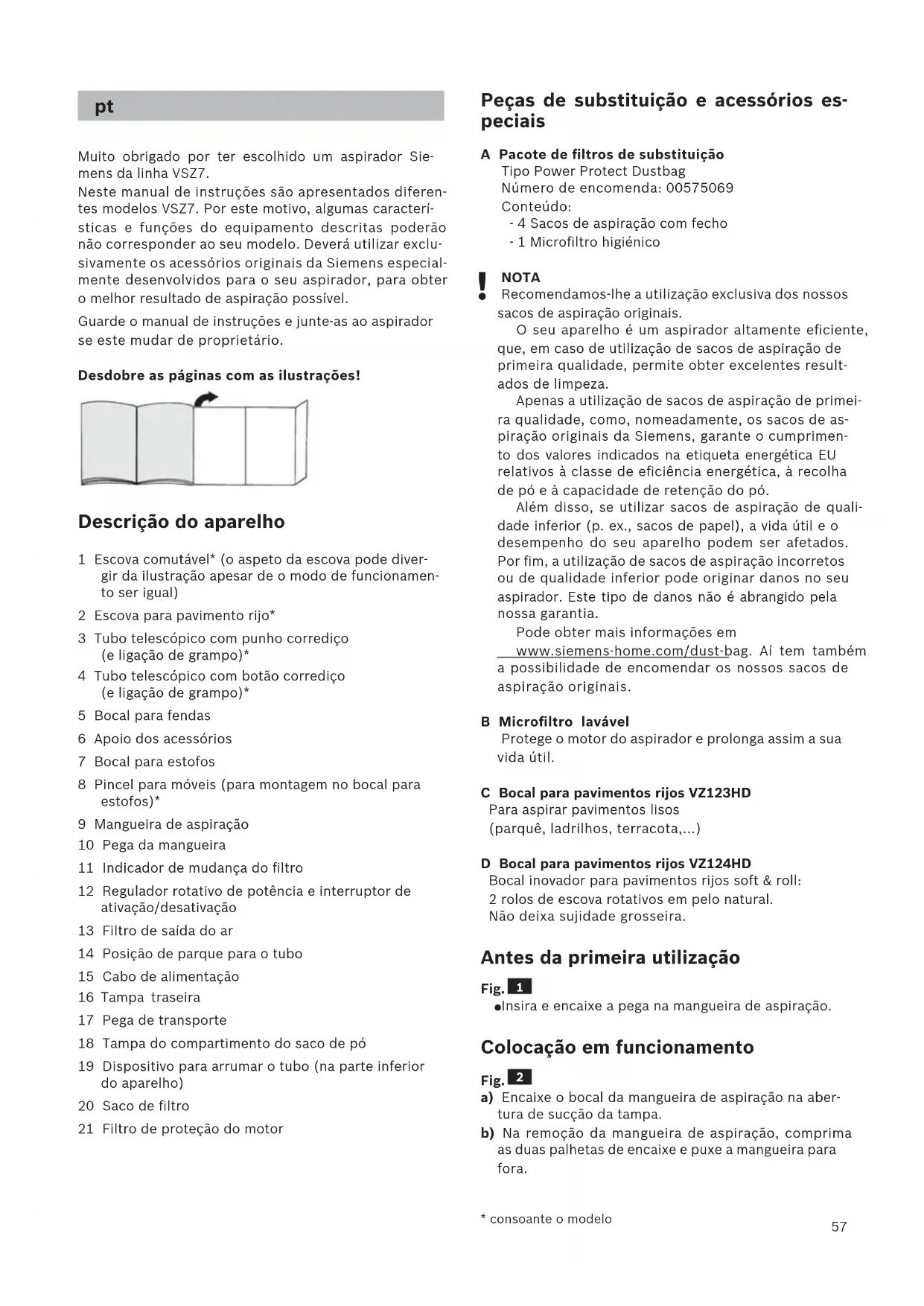 Muito obrigado por ter escolhido um aspirador Sie- mens da linha VSZ7. Neste manual de instruções são apresentados diferen- tes modelos VSZ7. Por este motivo, algumas caracterí- sticas e funções do equipamento descritas poderão não corresponder ao seu modelo. Deverá utilizar exclu- sivamente os acessórios originais da Siemens especial- mente desenvolvidos para o seu aspirador, para obter o melhor resultado de aspiração possível. Guarde o manual de instruções e junte-as ao aspirador se este mudar de proprietário. Desdobre as páginas com as ilustrações! Descrição do aparelho 1 Escova comutável* (o aspeto da escova pode diver- gir da ilustração apesar de o modo de funcionamen- to ser igual) 2 Escova para pavimento rijo* 3 Tubo telescópico com punho corrediço (e ligação de grampo)* 4 Tubo telescópico com botão corrediço (e ligação de grampo)* 5 Bocal para fendas 6 Apoio dos acessórios 7 Bocal para estofos 8 Pincel para móveis (para montagem no bocal para estofos)* 9 Mangueira de aspiração 10 Pega da mangueira 11 Indicador de mudança do filtro 12 Regulador rotativo de potência e interruptor de ativação/desativação 13 Filtro de saída do ar 14 Posição de parque para o tubo 15 Cabo de alimentação 16 Tampa traseira 17 Pega de transporte 18 Tampa do compartimento do saco de pó 19 Dispositivo para arrumar o tubo (na parte inferior do aparelho) 20 Saco de filtro 21 Filtro de proteção do motor