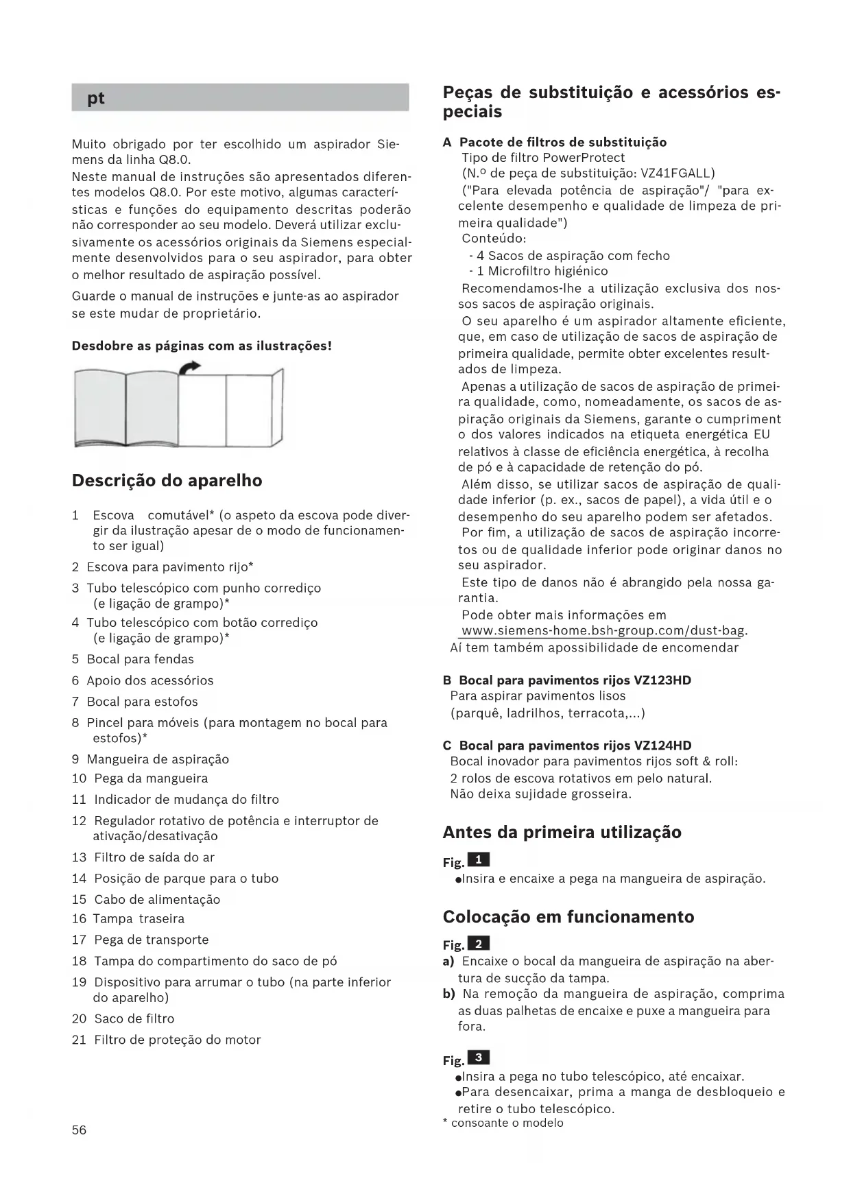 - consoante o modelo Peças de substituição e acessórios es- peciais A Pacote de filtros de substituição Tipo de filtro PowerProtect (N.º de peça de substituição: VZ41FGALL) ("Para elevada potência de aspiração"/ "para ex- celente desempenho e qualidade de limpeza de pri- meira qualidade") Conteúdo: - 4 Sacos de aspiração com fecho - 1 Microfiltro higiénico Recomendamos-lhe a utilização exclusiva dos nos- sos sacos de aspiração originais. O seu aparelho é um aspirador altamente eficiente, que, em caso de utilização de sacos de aspiração de primeira qualidade, permite obter excelentes result- ados de limpeza. Apenas a utilização de sacos de aspiração de primei- ra qualidade, como, nomeadamente, os sacos de as- piração originais da Siemens, garante o cumpriment o dos valores indicados na etiqueta energética EU relativos à classe de eficiência energética, à recolha de pó e à capacidade de retenção do pó. Além disso, se utilizar sacos de aspiração de quali- dade inferior (p. ex., sacos de papel), a vida útil e o desempenho do seu aparelho podem ser afetados. Por fim, a utilização de sacos de aspiração incorre- tos ou de qualidade inferior pode originar danos no seu aspirador. Este tipo de danos não é abrangido pela nossa ga- rantia. Pode obter mais informações em www.siemens-home.bsh-group.com/dust-bag. Aí tem também apossibilidade de encomendar B Bocal para pavimentos rijos VZ123HD Para aspirar pavimentos lisos (parquê, ladrilhos, terracota,...) C Bocal para pavimentos rijos VZ124HD Bocal inovador para pavimentos rijos soft & roll: 2 rolos de escova rotativos em pelo natural. Não deixa sujidade grosseira. Antes da primeira utilização Fig.