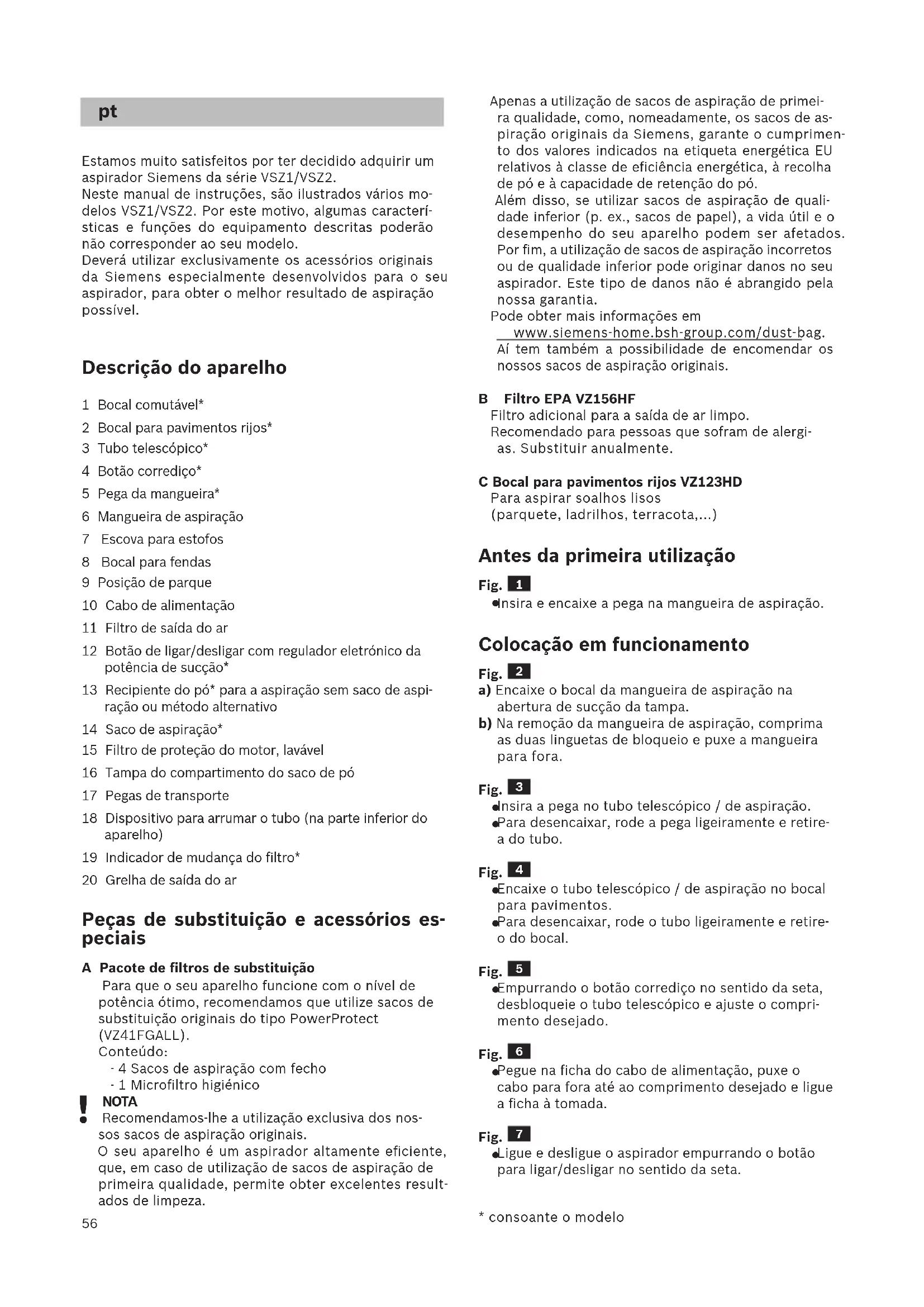 Estamos muito satisfeitos por ter decidido adquirir um aspirador Siemens da série VSZ1/VSZ2. Neste manual de instruções, são ilustrados vários mo- delos VSZ1/VSZ2. Por este motivo, algumas caracterí- sticas e funções do equipamento descritas poderão não corresponder ao seu modelo. Deverá utilizar exclusivamente os acessórios originais da Siemens especialmente desenvolvidos para o seu aspirador, para obter o melhor resultado de aspiração possível. Descrição do aparelho 1 Bocal comutável* 2 Bocal para pavimentos rijos* 3 Tubo telescópico* 4 Botão corrediço* 5 Pega da mangueira* 6 Mangueira de aspiração 7 Escova para estofos 8 Bocal para fendas 9 Posição de parque 10 Cabo de alimentação 11 Filtro de saída do ar 12 Botão de ligar/desligar com regulador eletrónico da potência de sucção* 13 Recipiente do pó* para a aspiração sem saco de aspi- ração ou método alternativo 14 Saco de aspiração* 15 Filtro de proteção do motor, lavável 16 Tampa do compartimento do saco de pó 17 Pegas de transporte 18 Dispositivo para arrumar o tubo (na parte inferior do aparelho) 19 Indicador de mudança do filtro* 20 Grelha de saída do ar Peças de substituição e acessórios es- peciais A Pacote de filtros de substituição Para que o seu aparelho funcione com o nível de potência ótimo, recomendamos que utilize sacos de substituição originais do tipo PowerProtect (VZ41FGALL). Conteúdo: - 4 Sacos de aspiração com fecho - 1 Microfiltro higiénico