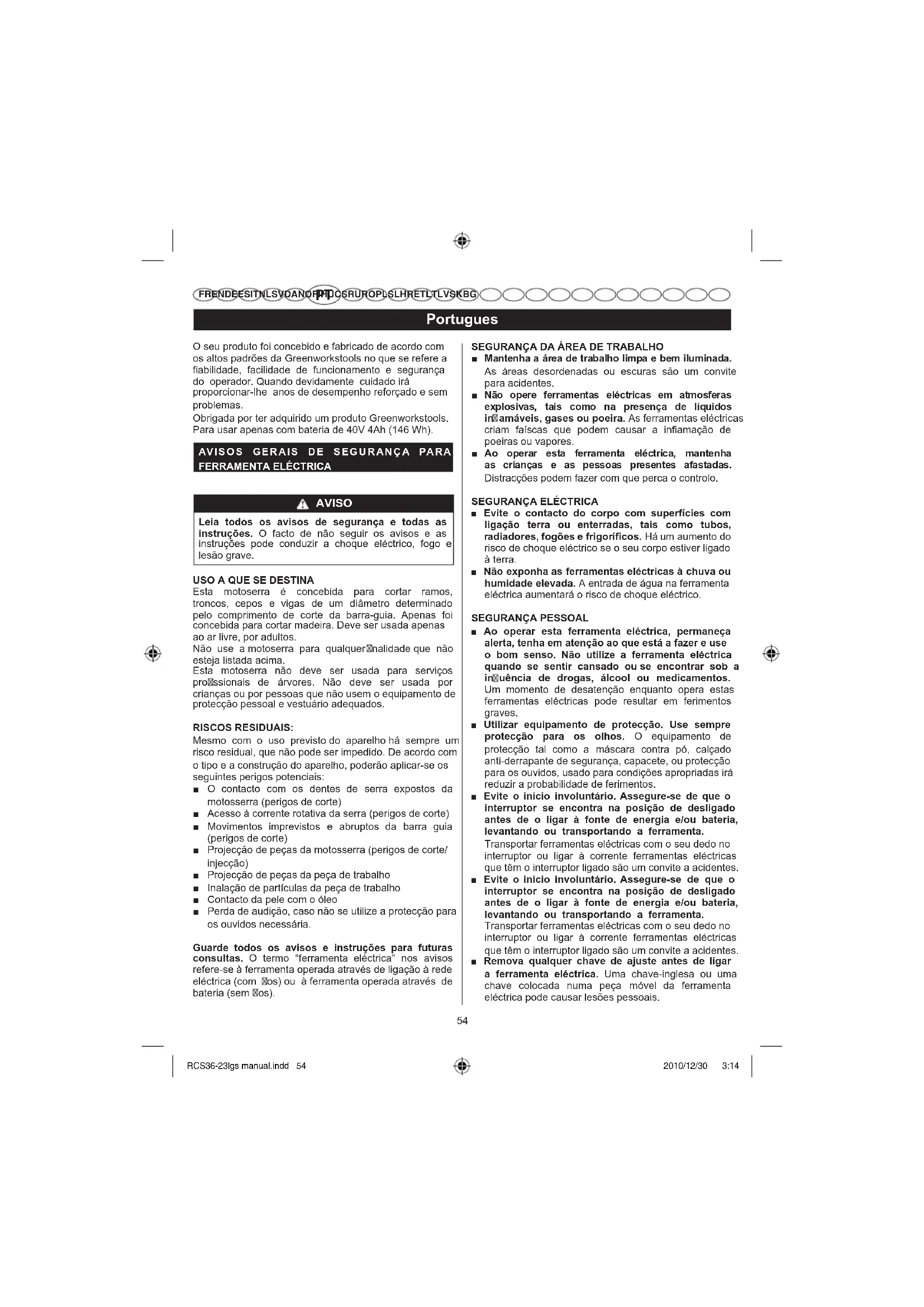 FR EN DE ES IT NL SV DA NO FI HU CS RU RO PL SL HR ET LT LV SK BG O seu produto foi concebido e fabricado de acordo com os altos padrões da Greenworkstools no que se refere a fiabilidade, facilidade de funcionamento e segurança do operador. Quando devidamente cuidado irá proporcionar-lhe anos de desempenho reforçado e sem problemas. Obrigada por ter adquirido um produto Greenworkstools. Para usar apenas com bateria de 40V 4Ah (146 Wh). AVIS O S GE R AIS D E SEG U RAN Ç A PARA