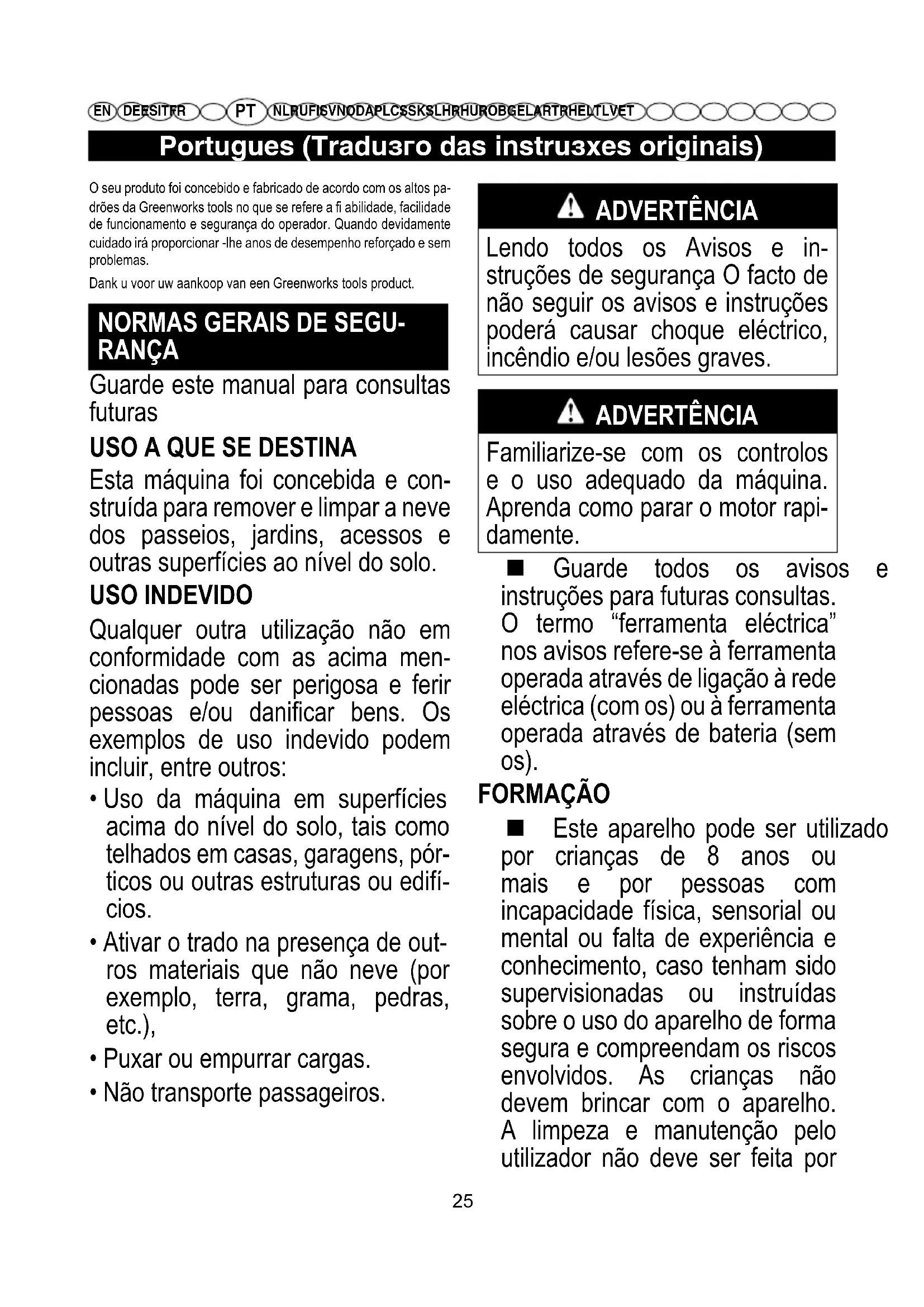 DE ES IT FR NL RU FI SV NO DA PL CS SK SL HR HU RO BG EL AR TR HE LT LV ET ADVERTÊNCIA Lendo todos os Avisos e in- struções de segurança O facto de não seguir os avisos e instruções poderá causar choque eléctrico, incêndio e/ou lesões graves. ADVERTÊNCIA Familiarize-se com os controlos e o uso adequado da máquina. Aprenda como parar o motor rapi- damente. Guarde todos os avisos e instruções para futuras consultas. O termo “ferramenta eléctrica” nos avisos refere-se à ferramenta operada através de ligação à rede eléctrica (com os) ou à ferramenta operada através de bateria (sem os). FORMAÇÃO Este aparelho pode ser utilizado por crianças de 8 anos ou mais e por pessoas com incapacidade física, sensorial ou mental ou falta de experiência e conhecimento, caso tenham sido supervisionadas ou instruídas sobre o uso do aparelho de forma segura e compreendam os riscos envolvidos. As crianças não devem brincar com o aparelho. A limpeza e manutenção pelo utilizador não deve ser feita por O seu produto foi concebido e fabricado de acordo com os altos pa- drões da Greenworks tools no que se refere a fi abilidade, facilidade de funcionamento e segurança do operador. Quando devidamente cuidado irá proporcionar -lhe anos de desempenho reforçado e sem problemas. Dank u voor uw aankoop van een Greenworks tools product.