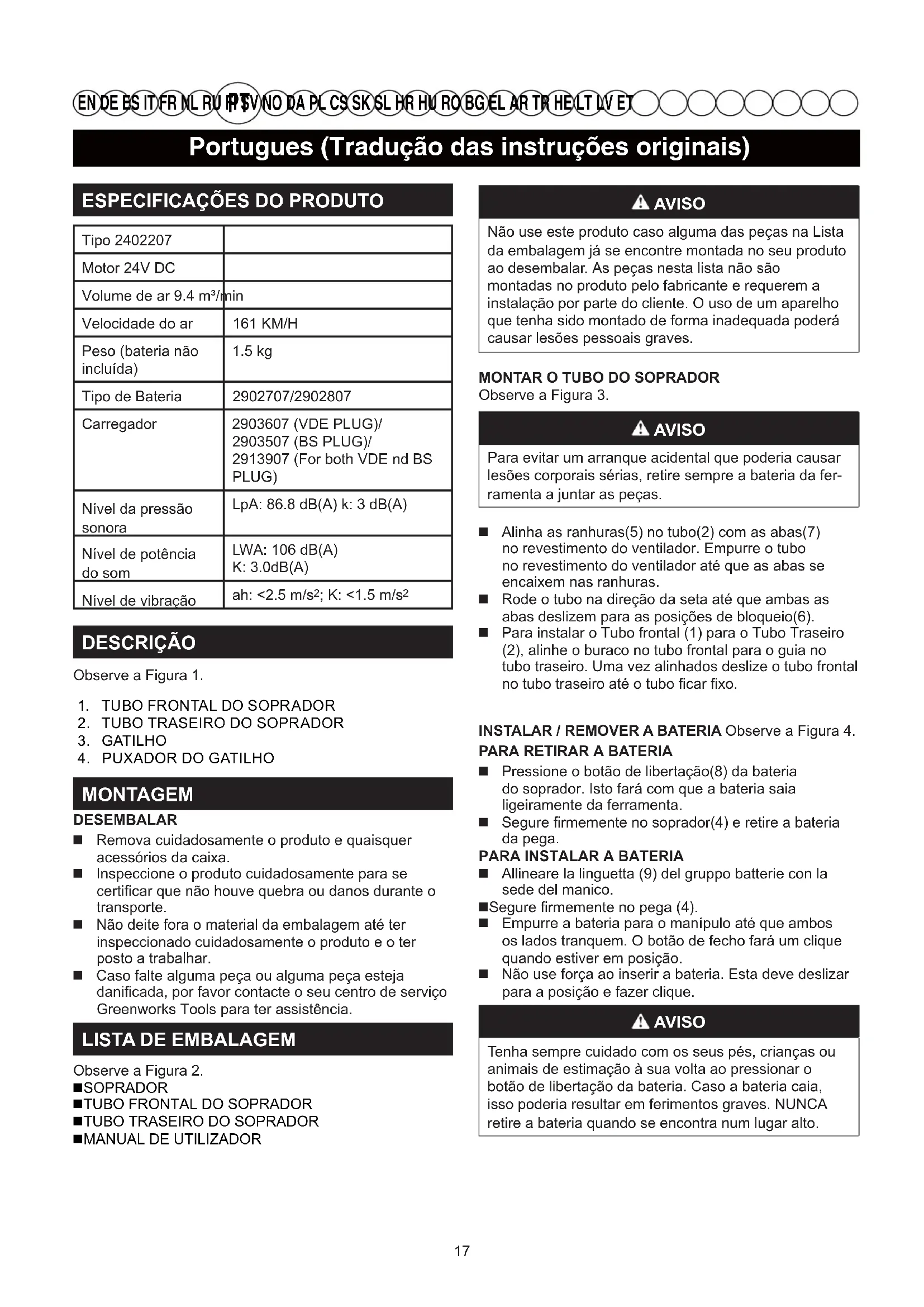 EN DE ES IT FR NL RU FI SV NO DA PL CS SK SL HR HU RO BG EL AR TR HE LT LV ET AVISO Para evitar ferimentos graves, use óculos desegurança em todos os momentos, quando opera esteaparelho. Use uma máscara facial ou máscara contrao pó em locais empoeirados. AVISO Para evitar lesões graves ou danos à unidadeassegure-se que o tubo do ventilador está colocadoantes de colocar a unidade em funcionamento. AVISO Para evitar ferimentos graves, não use roupa larga ouitens como lenços, cordas, correntes, laços, etc., quepoderiam ser atraídos para as saídas de ar. Para se]apanhados pelas saídas de ar, amarre o cabelocomprido para trás.OPERAR COM O SOPRADOR Para evitar espalhar detritos, direcione o soprador à volta das extremidades exteriores de uma pilha de detritos. Nunca sopre diretamente para o centro de uma pilha. Para reduzir os níveis do som, limite o número de peças de equipamento utilizadas a uma determinada hora. Use ancinhos e vassouras para dispersar os detritos antes de soprar. Em condições de poeira, humedeça ligeiramente as superfícies quando existe água disponível. Poupe água usando sopradores elétricos em vez de mangueiras para muitas aplicações de relvado e jardim, incluindo áreas tais como goteiras, painéis, pátios, grades, alpendres, e jardins. AVISO Siga estas instruções para evitar lesões e reduzir o risco de choque elétrico ou incêndio: Substitua imediatamente a bateria ou o carregador se a bateria ou o cabo do carregador apresentarem danos. Verifique que o interruptor se encontra na posição de desligado antes de retirar a bateria. Verifique se a bateria é removida e se o interruptor está na posição OFF antes de inspecionar, ajustar ou efetuar manutenção em qualquer peça do soprador. Leia, compreenda e respeite as instruções incluídas na secção intitulada Procedimento de carregamento. AVISO A bateria encaixa comodamente no revestimento de modo a evitar deslocações acidentais. Pode ser { UTILIZAÇÃO AVISO Não diminua a sua vigilância mesmo depois de se terfamiliarizado com o seu aparelho. Nunca se esqueçaque basta um segundo de falta de atenção para se ferirgravemente. AVISO Use sempre proteção para os olhos com os protetores laterais com a marcação que cumpre com ANSI Z87.1, juntamente com proteção para os ouvidos. Não cumprir com esta prática pode fazer com que os objetos sejam projetados para os seus olhos, causando outras eventuais lesões graves. AVISO Não utilize quaisquer equipamentos complementares ou acessórios não recomendados pelo fabricante deste produto. O uso de equipamentos complementares ou acessórios não recomendados pode provocar graves ferimentos físicos. Antes de cada utilização, verifique todo o aparelho de forma a ver se existem peças danificadas, em falta ou soltas, tais como parafusos, porcas, cavilhas, tampas, etc. Aperte firmemente todos os grampos e tampas e não utilize o aparelho até que as peças danificadas ou em falta sejam substituídas.ANTES DA PRIMEIRA UTILIZAÇÃO AVISO Retire sempre a bateria do seu produto quando estiver a colocar peças, a efetuar ajustes, limpar ou quando não estiver a ser utilizado. A remoção da bateria evitará o funcionamento acidental da ferramenta que poderá provocar ferimentos graves.LIGAR/DESLIGAR O SOPRADOR Antes de o colocar em funcionamento, assegure-se de que o soprador está em perfeitas condições para garantir uma operação segura. Certifique-se de que a bateria está instalada no soprador. Aperte o gatilho para dar início ao funcionamento do soprador. Solte o gatilho para parar. 18Portugues (Tradução das instruções originais)