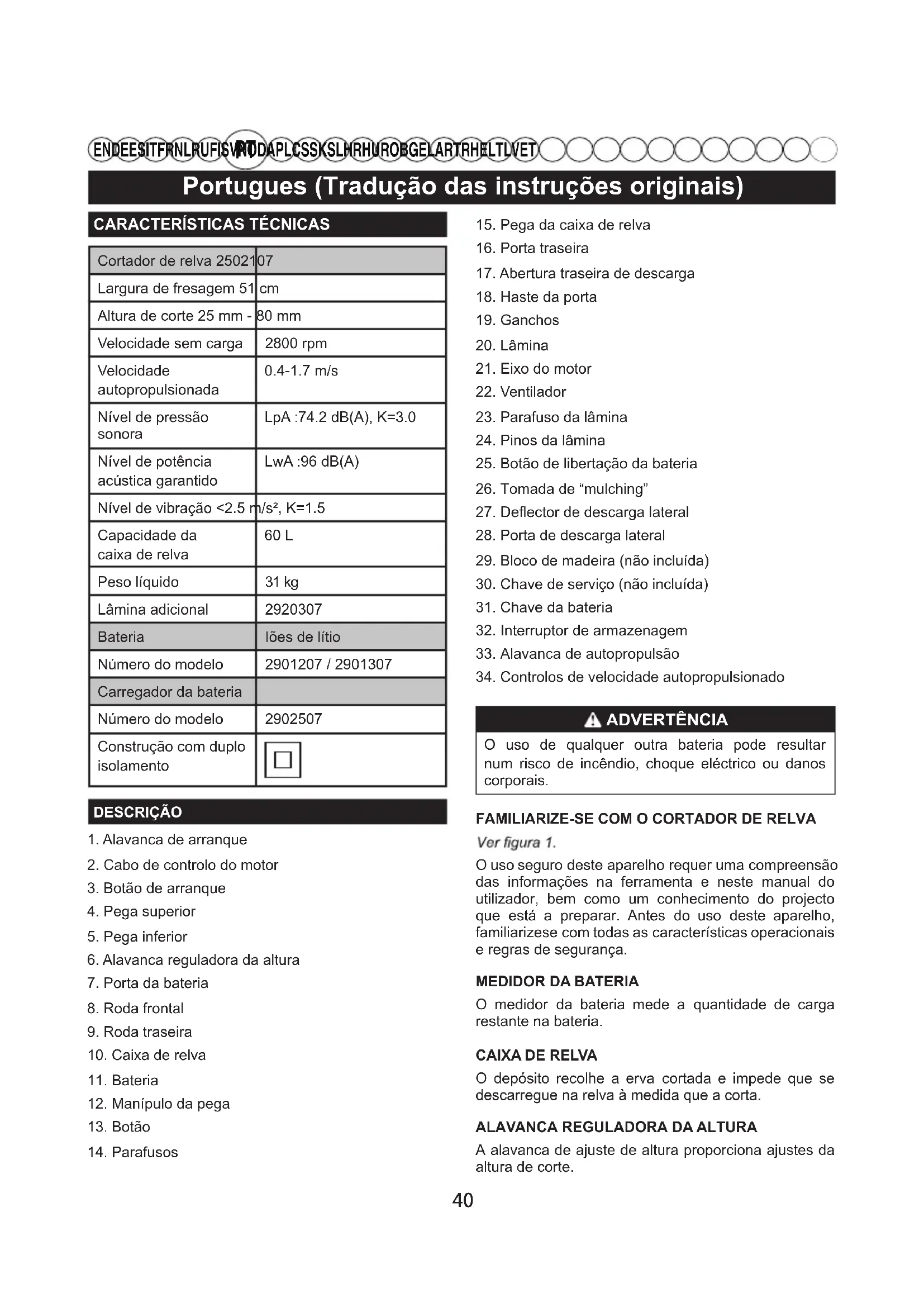 EN DE ES IT FR NL RU FI SV NO DA PL CS SK SL HR HU RO BG EL AR TR HE LT LV ET CARACTERÍSTICAS TÉCNICASCortador de relva 2502107Largura de fresagem 51 cmAltura de corte 25 mm - 80 mmVelocidade sem carga 2800 rpmVelocidadeautopropulsionada0.4-1.7 m/sNível de pressão sonora LpA :74.2 dB(A), K=3.0Nível de potência acústica garantidoLwA :96 dB(A)Nível de vibração <2.5 m/s², K=1.5Capacidade dacaixa de relva 60 L Peso líquido 31 kg Lâmina adicional 2920307Bateria Iões de lítioNúmero do modelo 2901207 / 2901307Carregador da bateriaNúmero do modelo 2902507Construção com duploisolamentoDESCRIÇÃO1. Alavanca de arranque2. Cabo de controlo do motor3. Botão de arranque 4. Pega superior5. Pega inferior6. Alavanca reguladora da altura7. Porta da bateria8. Roda frontal9. Roda traseira10. Caixa de relva11. Bateria12. Manípulo da pega13. Botão14. Parafusos15. Pega da caixa de relva16. Porta traseira17. Abertura traseira de descarga18. Haste da porta19. Ganchos20. Lâmina21. Eixo do motor22. Ventilador23. Parafuso da lâmina24. Pinos da lâmina25. Botão de libertação da bateria26. Tomada de “mulching”27. Deflector de descarga lateral28. Porta de descarga lateral29. Bloco de madeira (não incluída)30. Chave de serviço (não incluída)31. Chave da bateria32. Interruptor de armazenagem33. Alavanca de autopropulsão 34. Controlos de velocidade autopropulsionado ADVERTÊNCIA O uso de qualquer outra bateria pode resultar num risco de incêndio, choque eléctrico ou danos corporais.FAMILIARIZE-SE COM O CORTADOR DE RELVAO uso seguro deste aparelho requer uma compreensão das informações na ferramenta e neste manual do utilizador, bem como um conhecimento do projecto que está a preparar. Antes do uso deste aparelho, familiarizese com todas as características operacionais e regras de segurança.MEDIDOR DA BATERIA O medidor da bateria mede a quantidade de carga restante na bateria.CAIXA DE RELVA O depósito recolhe a erva cortada e impede que se descarregue na relva à medida que a corta.ALAVANCA REGULADORA DA ALTURA A alavanca de ajuste de altura proporciona ajustes da altura de corte. 40Portugues (Tradução das instruções originais)