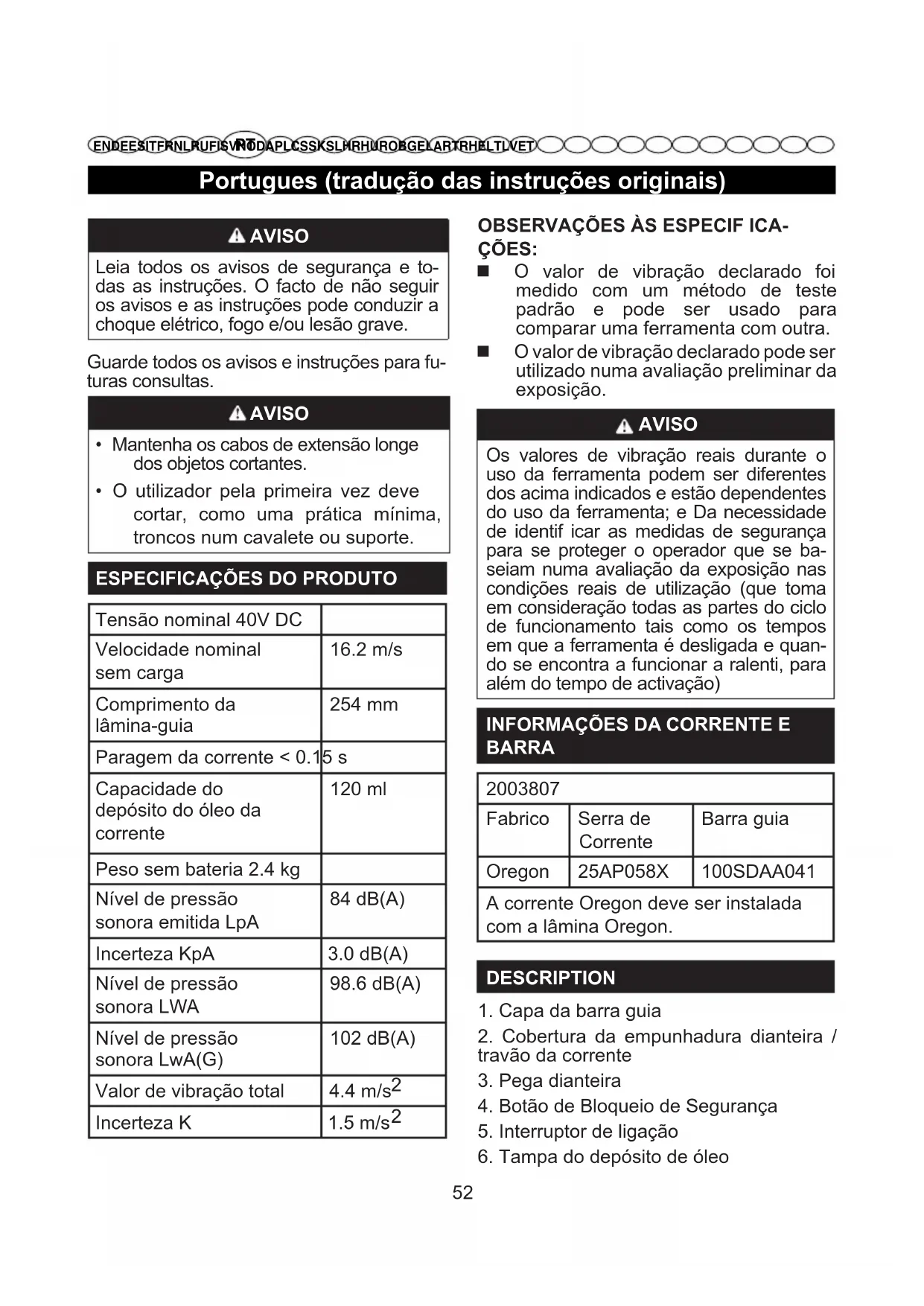 BARRA” mais adiante neste manual. AVISO Verif ique a tensão da corrente antes de cada utilização da serra. AVISO Nunca opere a motosserra sem lubrif icação de corrente suf iciente dado que tal pode danif icar a serra e constitui uma ameaça para a segurança. Verif ique o nível de lubrif icante da corrente antes de cada utilização! Para impedir o ricochete, siga estas in- struções de segurança: Nunca corte com a ponta da barra guia! Seja cuidadoso com os cortes contínuos em que já está a trabalhar! Comece sempre os cortes com a motosserra já em funcionamento. Certif ique-se de que a corrente da serra está sempre correctamente af iada. Nunca corte transversalmente mais do que um ramo de cada vez! Ao desbastar os ramos, tenha cuidado para não embater noutros ramos. Ao cortar transversalmente, tenha em atenção aos troncos que se encontrem muito próximos um doPortugues (tradução das instruções originais)