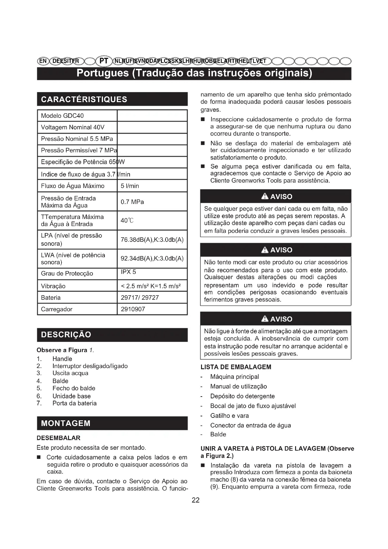 DE ES IT FR NL RU FI SV NO DA PL CS SK SL HR HU RO BG EL AR TR HE LT LV ET Portugues (Tradução das instruções originais) CARACTÉRISTIQUES Modelo GDC40 Voltagem Nominal 40V Pressão Nominal 5.5 MPa Pressão Permissível 7 MPa Especifição de Potência 650W Indice de uxo de água 3.7 l/min Fluxo de Água Máximo 5 l/min Pressão de Entrada Máxima da Água