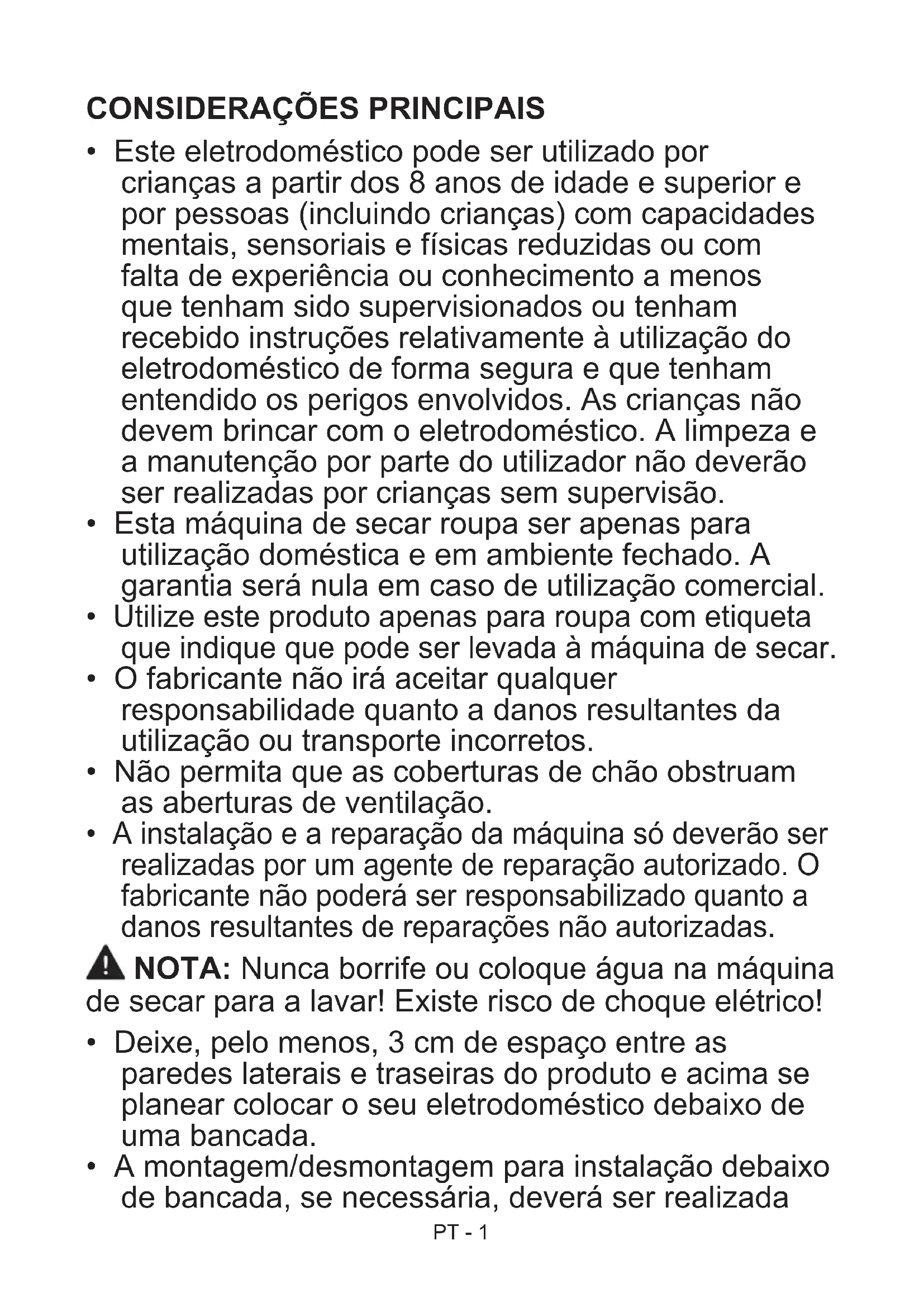 Este eletrodométrico pode ser realizado por crianças a partir dos 8 anos de idade e superior e por pessoas (incluindo crianças) com capacidades mentalais, sensoriais e físicas reduzidas ou com falta de experiência ou conheçimento a menos que tenham sido supervisionados ou tenham recebido instruções relativamente à utilização do eletrodométrico de forma segura e que tenham sentido os perigos envolvidos. As crianças não devem brincar com o eletrodométrico. A limpeza e a manutenção por parte do Utilizador não deverão ser realizadas por crianças sem supervisão.