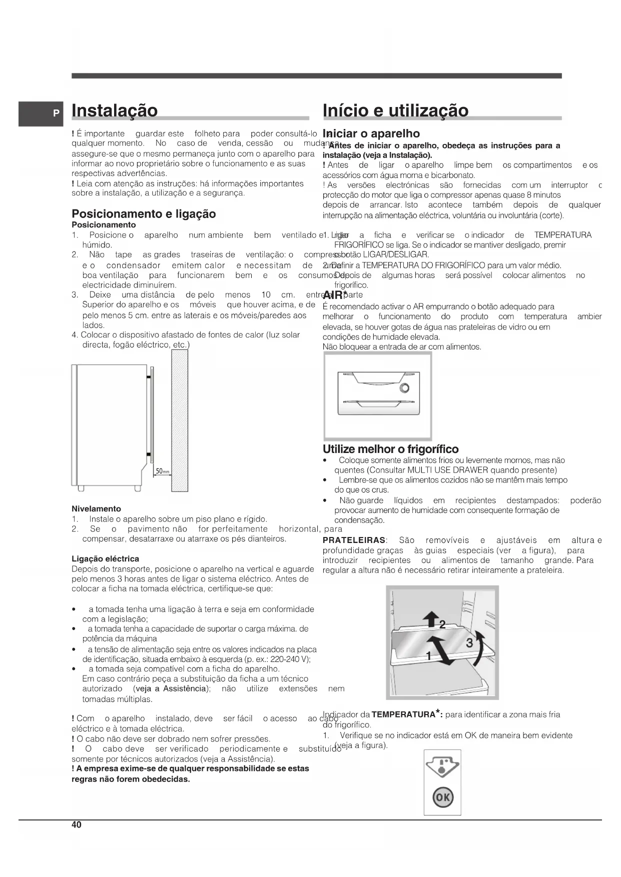 Nivelamento1. Instaleoaparelhosobreumpisoplanoerígido.2. Se o pavimentonão forperfeitamente horizontal,paracompensar,desatarraxeouatarraxeospésdianteiros.Ligação eléctricaDepoisdotransporte,posicioneoaparelhonaverticaleaguardepelomenos3horasantesdeligarosistemaeléctrico.Antesdecolocarafichanatomadaeléctrica,certifique-seque:• atomadatenhaumaligaçãoàterraesejaemconformidadecomalegislação;• atomadatenhaacapacidadedesuportarocargamáxima.depotênciadamáquina• atensãodealimentaçãosejaentreosvaloresindicadosnaplacadeidentificação,situadaembaixoàesquerda(p.ex.:220-240V);• atomadasejacompatívelcomafichadoaparelho. Emcasocontráriopeçaasubstituiçãodafichaaumtécnicoautorizado (veja a Assistência); não utilize extensões nemtomadasmúltiplas.!Com oaparelho instalado,deve serfácil oacesso aocaboeléctricoeàtomadaeléctrica.!Ocabonãodeveserdobradonemsofrerpressões.! O cabodeve serverificado periodicamentee substituídosomenteportécnicosautorizados(vejaaAssistência).! A empresa exime-se de qualquer responsabilidade se estas regras não forem obedecidas. Início e utilização Iniciar o aparelho ! Antes de iniciar o aparelho, obedeça as instruções para a instalação (veja a Instalação).!Antes de ligar oaparelho limpebem oscompartimentos eosacessórioscomáguamornaebicarbonato.!As versões electrónicas são fornecidas comum interruptor deprotecçãodomotorqueligaocompressorapenasquase8minutosdepoisde arrancar.Isto acontece também depois de qualquerinterrupçãonaalimentaçãoeléctrica,voluntáriaouinvoluntária(corte).1.Ligar a ficha e verificarse oindicador de TEMPERATURA DOFRIGORÍFICOseliga.Seoindicadorsemantiverdesligado,premirobotãoLIGAR/DESLIGAR.2.DefiniraTEMPERATURADOFRIGORÍFICOparaumvalormédio.Depoisde algumashoras serápossível colocaralimentos nofrigorífico. AIR* ÉrecomendadoactivaroARempurrandoobotãoadequadoparamelhorar o funcionamento do produto com temperatura ambienteelevada,sehouvergotasdeáguanasprateleirasdevidroouemcondiçõesdehumidadeelevada.Nãobloquearaentradadearcomalimentos. Utilize melhor o frigorífico