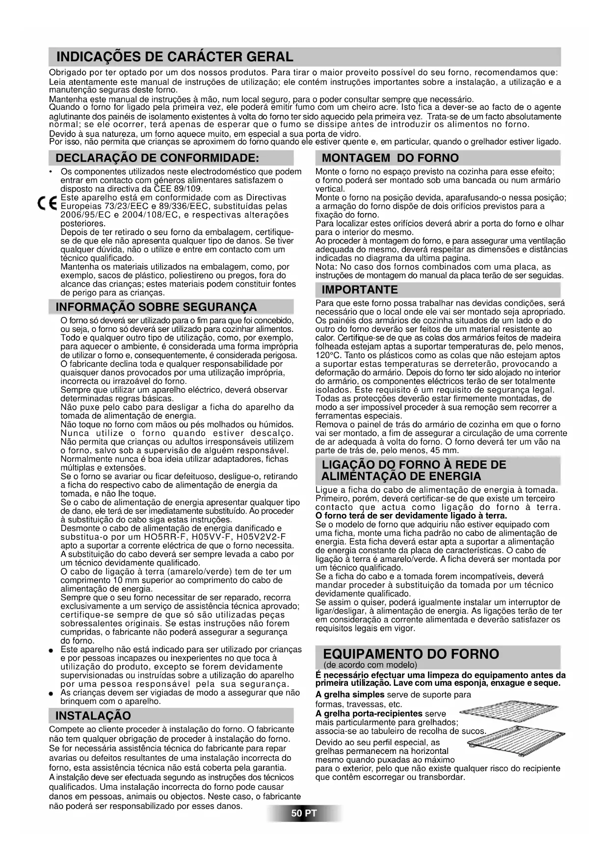 - Os componentes utilizados neste electrodoméstico que podem entrar em contacto com géneros alimentares satisfazem o disposto na directiva da CEE 89/109. Este aparelho está em conformidade com as Directivas Europeias 73/23/EEC e 89/336/EEC, substituídas pelas 2006/95/EC e 2004/108/EC, e respectivas alterações posteriores. Depois de ter retirado o seu forno da embalagem, certifique- se de que ele não apresenta qualquer tipo de danos. Se tiver qualquer dúvida, não o utilize e entre em contacto com um técnico qualificado. Mantenha os materiais utilizados na embalagem, como, por exemplo, sacos de plástico, poliestireno ou pregos, fora do alcance das crianças; estes materiais podem constituir fontes de perigo para as crianças.