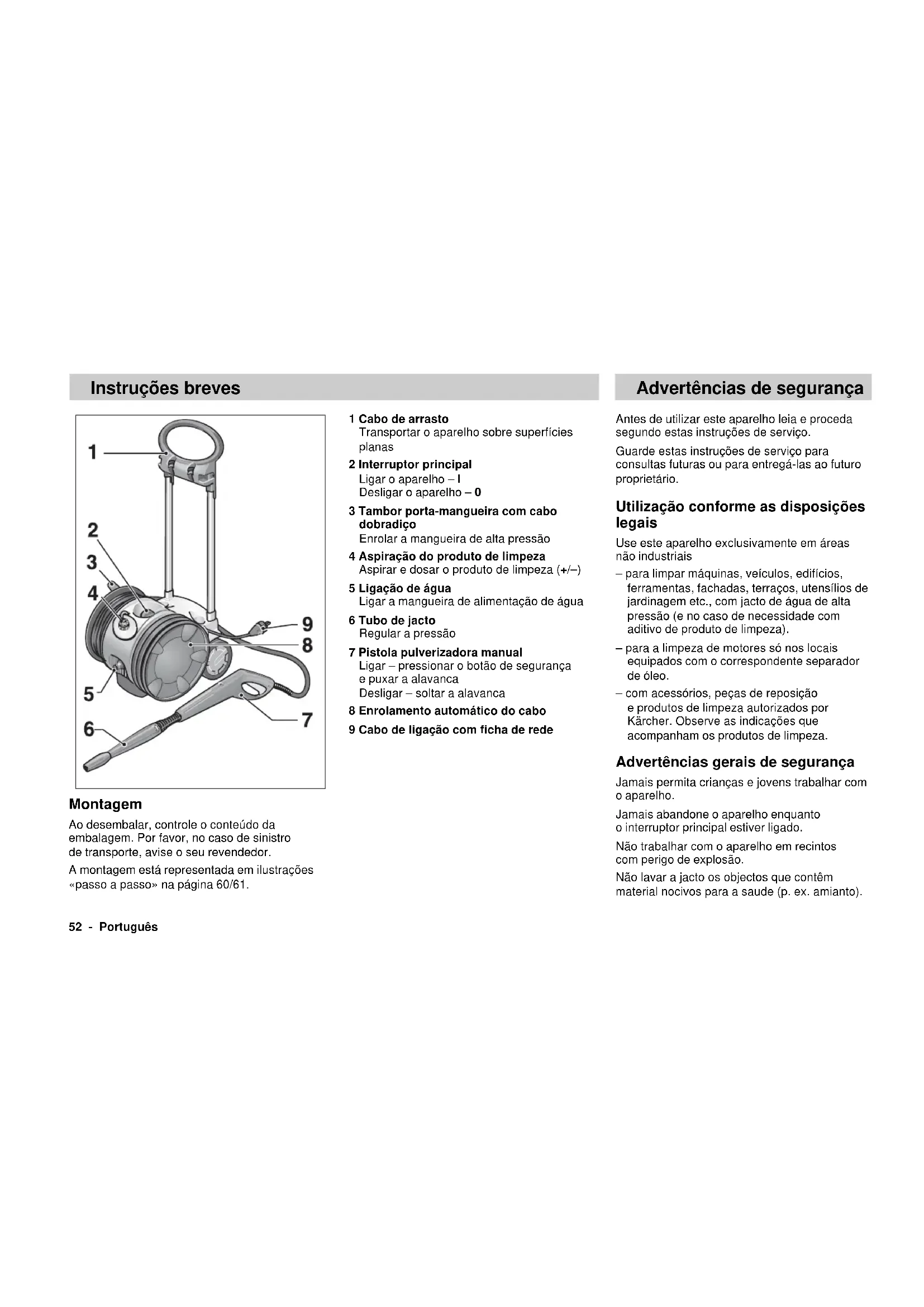 Procedimiento de evaluación de la conformidad: Annex V Nivel de potencia acústica medido: 91 dB(A) garantizado: 93 dB(A) Mediante una serie de medidas internas, queda asegu- rado que los aparatos y equipos de serie cumplan siem- pre las exigencias formuladas en las directivas comuni- tarias actuales y en las normas correspondientes a apli- car. Los firmantes actúan autorizados y con poder otor- gado por la dirección de la empresa. 5.957-566 (04/03)52 - Português Advertências de segurança 1 Cabo de arrasto Transportar o aparelho sobre superfícies planas 2 Interruptor principal Ligar o aparelho – I Desligar o aparelho – 0 3 Tambor porta-mangueira com cabo dobradiço Enrolar a mangueira de alta pressão 4 Aspiração do produto de limpeza Aspirar e dosar o produto de limpeza (+/–) 5 Ligação de água Ligar a mangueira de alimentação de água 6 Tubo de jacto Regular a pressão 7 Pistola pulverizadora manual Ligar – pressionar o botão de segurança e puxar a alavanca Desligar – soltar a alavanca 8 Enrolamento automático do cabo 9 Cabo de ligação com ficha de rede Instruções breves Antes de utilizar este aparelho leia e proceda segundo estas instruções de serviço. Guarde estas instruções de serviço para consultas futuras ou para entregá-las ao futuro proprietário. Utilização conforme as disposições legais Use este aparelho exclusivamente em áreas não industriais – para limpar máquinas, veículos, edifícios, ferramentas, fachadas, terraços, utensílios de jardinagem etc., com jacto de água de alta pressão (e no caso de necessidade com aditivo de produto de limpeza). – para a limpeza de motores só nos locais equipados com o correspondente separador de óleo. – com acessórios, peças de reposição e produtos de limpeza autorizados por Kärcher. Observe as indicações que acompanham os produtos de limpeza. Advertências gerais de segurança Jamais permita crianças e jovens trabalhar com o aparelho. Jamais abandone o aparelho enquanto o interruptor principal estiver ligado. Não trabalhar com o aparelho em recintos com perigo de explosão. Não lavar a jacto os objectos que contêm material nocivos para a saude (p. ex. amianto). Montagem Ao desembalar, controle o conteúdo da embalagem. Por favor, no caso de sinistro de transporte, avise o seu revendedor. A montagem está representada em ilustrações «passo a passo» na página 60/61.Português - 53