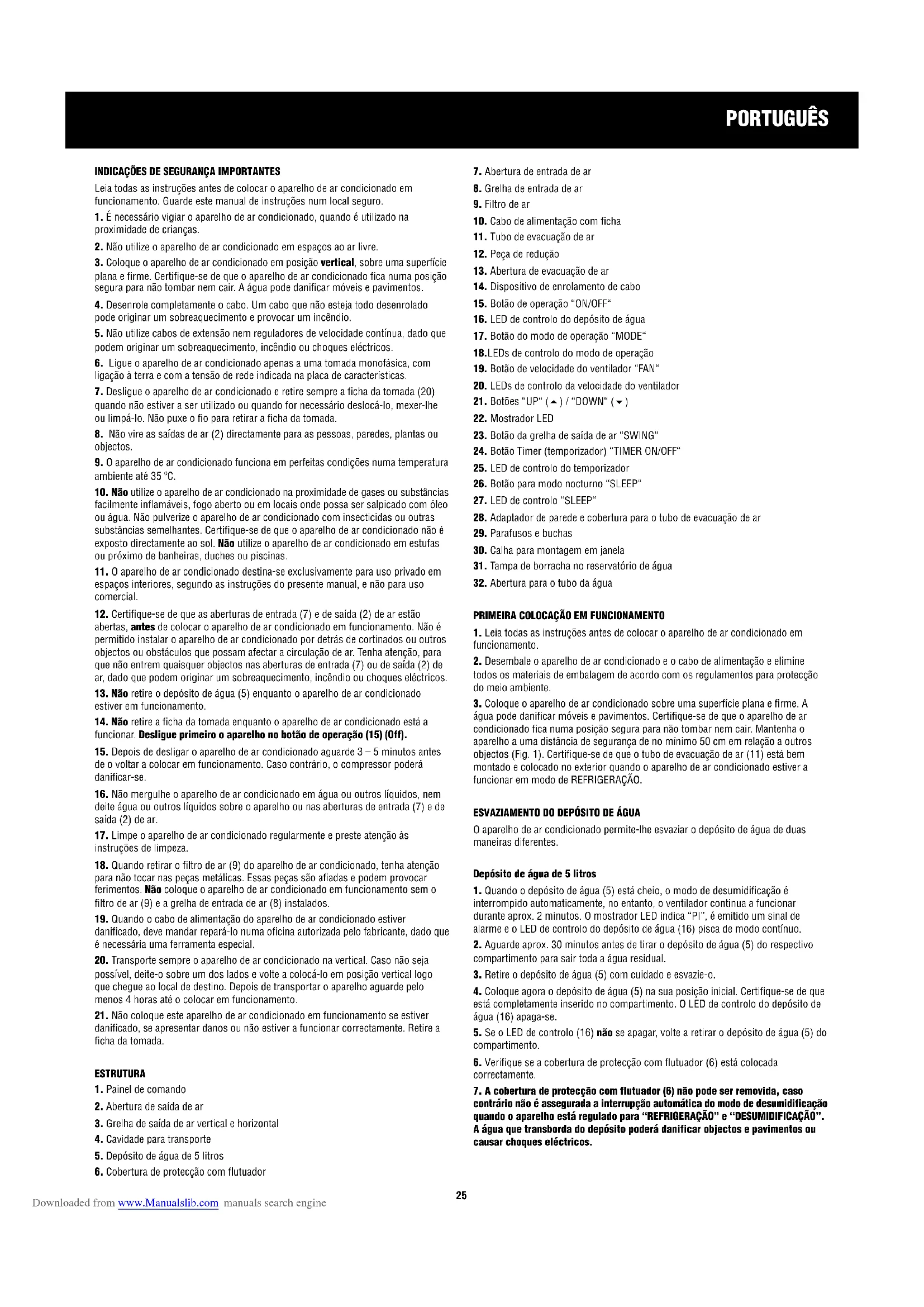 contrário não é assegurada a interrupção automática do modo de desumidificação quando o aparelho está regulado para “REFRIGERAÇÃO” e “DESUMIDIFICAÇÃO”. A água que transborda do depósito poderá danificar objectos e pavimentos ou causar choques eléctricos. Downloaded from www.Manualslib.com manuals search engine8. Volte a inserir novamente o depósito de água (5), conforme descrito no ponto 4.