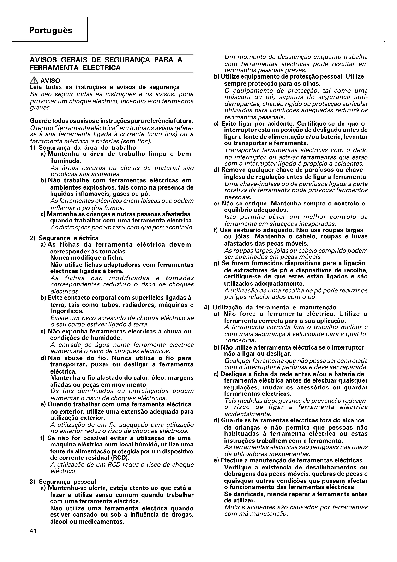 AVISO Leia todas as instruções e avisos de segurança Se não seguir todas as instruções e os avisos, pode provocar um choque eléctrico, incêndio e/ou ferimentos graves. Guarde todos os avisos e instruções para referência futura. O termo “ferramenta eléctrica” em todos os avisos refere- se à sua ferramenta ligada à corrente (com fios) ou à ferramenta eléctrica a baterias (sem fios).
