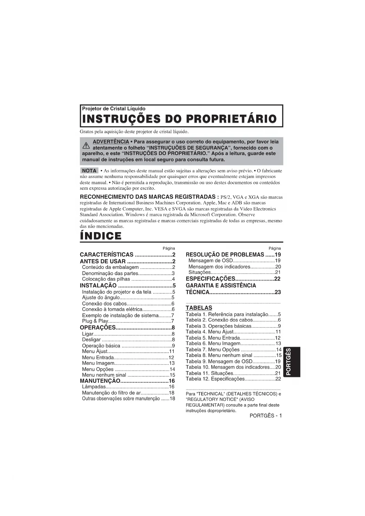 ADVERTÊNCIA • Para assegurar o uso correto do equipamento, por favor leia atentamente o folheto “INSTRUÇUÕES DE SEGURANÇA”, fornecido com o aparelho, e este “INSTRUÇÕES DO PROPRIETÁRIO.” Após a leitura, guarde este manual de instruções em local seguro para consulta futura.PORTGÊS - 2 CARACTERÍSTICAS CARACTERÍSTICAS Este projetor de cristal líquido é usado para projetar em tela vários sinais de computador, bem como sinais de vídeo NTSC/PAL/SECAM. O espaço exigido para instalação é pequeno, e grandes imagens podem ser facilmente obtidas. Brilho excepcional A lâmpada UHB e o sistema óptico de alta eficiência asseguram brilho de grande intensidade. Função de ampliação parcial Partes interessantes das imagens podem ser ampliadas para visualização mais detalhada. Função de correção de distorções Imagens livres de distorções estão rapidamente disponíveis. Função de Ruído Superbaixo. O nível de ruído acústico do aparelho pode ser reduzido.