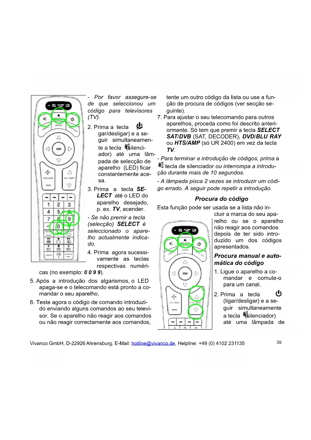 função do dígito do código que pretende ler. Por exemplo, se tiver premido +1 e tiver ajustado o código exemplar 1234, a lâmpada pisca 1 vez para indicar a casa de milhares com 1. Assim só precisa de con- tar. Com +2 é emitida a casa centesimal, p. ex. pisca 2 vezes para o 2 de 1234. Com +3 é emitida a casa decimal, p. ex. pisca 3 vezes para o 3 de 1234. E com +4 é emitida a casa de unidades, p. ex. pisca 4 vezes para o 4 em 1234. - Para a indicação de zero nada pisca. Copiar as teclas originais para a aprendiz- agem das funções de comando em falta (só UR 2400) A função LEARN serve de complemento para os códigos de comando pré-programados. Em mui- tos dos casos, os códigos pré-configurados es- tão a cargo do comando de quase todas as fun- ções, mas ainda assim faltam alguns. Poderá Vivanco GmbH, D-22926 Ahrensburg, E-Mail: hotline@vivanco.de, Helpline: +49 (0) 4102 231135 40até ser possível que não tenha encontrado qual- quer código funcional. Através da função de aprendizagem poderá assumir com o teleco- mando até um máximo de 206 teclas de fun- ções, num máximo de 40 comandos por apare- lho. Cada um dos novos códigos programados anulará o código anterior correspondente a essa tecla.