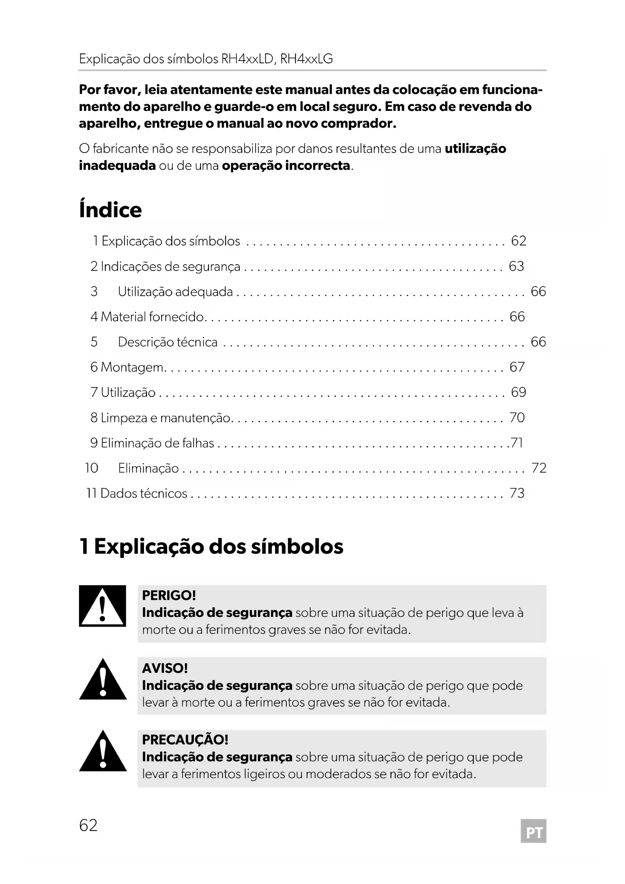 PERIGO! Indicação de segurança sobre uma situação de perigo que leva à morte ou a ferimentos graves se não for evitada. AVISO! Indicação de segurança sobre uma situação de perigo que pode levar à morte ou a ferimentos graves se não for evitada. PRECAUÇÃO! Indicação de segurança sobre uma situação de perigo que pode levar a ferimentos ligeiros ou moderados se não for evitada. RH430-RH440-RH460-LD-LG--IO-16s.book Seite 62 Mittwoch, 17. Juli 2019 5:35 17PT RH4xxLD, RH4xxLG Indicações de segurança