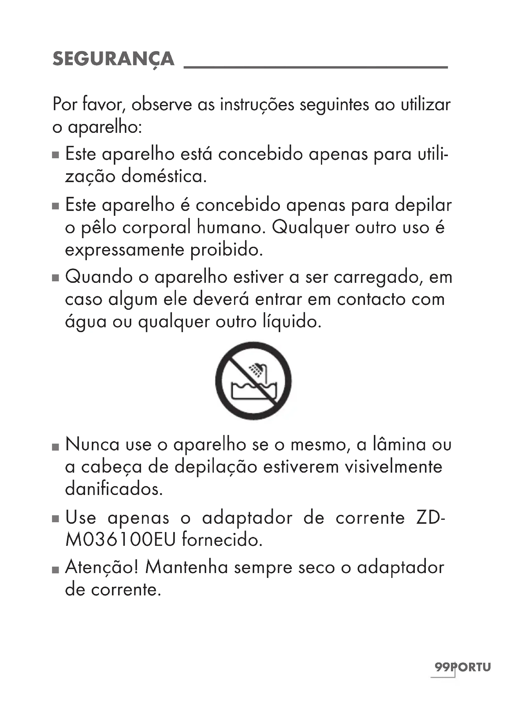 Este aparelho é concebido apenas para depilar o pêlo corporal humano. Qualquer outro uso é expressamente proibido.