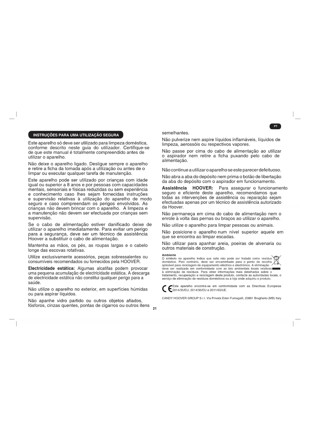 Controleer of de multicyclonische afscheidingseenheid gereinigd moet worden. Raadpleeg “Schoonmaken van de multicyclonische afscheidingseenheid”. F. Is de stofzuiger oververhit? Zo ja, dan duurt het ongeveer dertig minuten voordat het toestel weer gebruiksklaar is. BELANGRIJKE INFORMATIE Originele reserveonderdelen en toebehoren van Hoover Gebruik uitsluitend originele reserveonderdelen van Hoover. Deze zijn verkrijgbaar bij uw Hoover dealer. Als u onderdelen bestelt, vermeld dan altijd het modelnummer. Hoover Service Als u de onderhoudsdienst, reserveonderdelen of verbruiksgoederen op enig moment nodig heeft, neem dan alstublieft contact op met de lokale Hoover Service Vestiging. Kwaliteit De fabrieken van Hoover zijn op onafhankelijke wijze getest op kwaliteit. Onze producten worden vervaardigd aan de hand van een kwaliteitssysteem dat voldoet aan de vereisten van ISO 9001. Uw garantie De garantievoorwaarden voor dit toestel worden bepaald door onze vertegenwoordiger in het land waar het toestel wordt verkocht. Details omtrent deze voorwaarden zijn verkrijgbaar bij de dealer waar u het toestel hebt gekocht. Wanneer u aanspraak wilt maken op deze garantie, dan moet u het verkoop- of ontvangstbewijs voorleggen. Wijzigingen zijn zonder voorafgaande kennisgeving mogelijk. NL21 INSTRUÇÕES PARA UMA UTILIZAÇÃO SEGURA Este aparelho só deve ser utilizado para limpeza doméstica, conforme descrito neste guia do utilizador. Certique-se de que este manual é totalmente compreendido antes de utilizar o aparelho. Não deixe o aparelho ligado. Desligue sempre o aparelho e retire a cha da tomada após a utilização ou antes de o limpar ou executar qualquer tarefa de manutenção. Este aparelho pode ser utilizado por crianças com idade igual ou superior a 8 anos e por pessoas com capacidades mentais, sensoriais e físicas reduzidas ou sem experiência e conhecimento caso lhes sejam fornecidas instruções e supervisão relativas à utilização do aparelho de modo seguro e caso compreendam os perigos envolvidos. As crianças não devem brincar com o aparelho. A limpeza e a manutenção não devem ser efectuada por crianças sem supervisão. Se o cabo de alimentação estiver danicado deixe de utilizar o aparelho imediatamente. Para evitar um perigo para a segurança, deve ser um técnico de assistência Hoover a substituir o cabo de alimentação. Mantenha as mãos, os pés, as roupas largas e o cabelo longe das escovas rotativas. Utilize exclusivamente acessórios, peças sobressalentes ou consumíveis recomendados ou fornecidos pela HOOVER. Electricidade estática: Algumas alcatifas podem provocar uma pequena acumulação de electricidade estática. A descarga de electricidade estática não constitui qualquer perigo para a saúde. Não utilize o aparelho no exterior, em superfícies húmidas ou para aspirar líquidos. Não apanhe vidro partido ou outros objetos aados, fósforos, cinzas quentes, pontas de cigarros ou outros itens semelhantes. Não pulverize nem aspire líquidos inamáveis, líquidos de limpeza, aerossóis ou respectivos vapores. Não passe por cima do cabo de alimentação ao utilizar o aspirador nem retire a cha puxando pelo cabo de alimentação. Não continue a utilizar o aparelho se este parecer defeituoso. Não abra a aba do depósito nem prima o botão de libertação da aba do depósito com o aspirador em funcionamento. Assistência HOOVER: Para assegurar o funcionamento seguro e eciente deste aparelho, recomendamos que todas as intervenções de assistência ou reparação sejam efectuadas apenas por um técnico de assistência autorizado da Hoover. Não permaneça em cima do cabo de alimentação nem o enrole à volta das pernas ou braços ao utilizar o aparelho. Não utilize o aparelho para limpar pessoas ou animais. Não posicione o aparelho num nível superior aquele em que se encontra ao limpar escadas. Não utilizar para apanhar areia, poeiras de alvenaria ou outros materiais de construção. Ambiente O símbolo no aparelho indica que este não pode ser tratado como resíduo doméstico. Pelo contrário, deve ser encaminhado para o ponto de recolha aplicável para reciclagem de equipamento eléctrico e electrónico. A eliminação deve ser realizada em conformidade com as leis ambientais locais relativas à eliminação de resíduos. Para obter informações mais detalhadas sobre o tratamento, recuperação e reciclagem deste produto, contacte as autoridades locais, o serviço de eliminação de resíduos domésticos ou a loja onde adquiriu o produto. Este aparelho encontra-se em conformidade com as Directivas Europeias 2014/35/EU, 2014/30/EU e 2011/65/UE. CANDY HOOVER GROUP S.r.l. Via Privata Eden Fumagalli, 20861 Brugherio (MB) Italy PT22 A. Pedal Ligar/Desligar B. Tampa do ltro do pré-motor C. Manípulo do contentor D. Corpo interno do depósito E. Botão de libertação da aba do depósito F. Detetor mecânico de depósito cheio G. Botão do fecho da extremidade do tubo exível H. Tubo exível