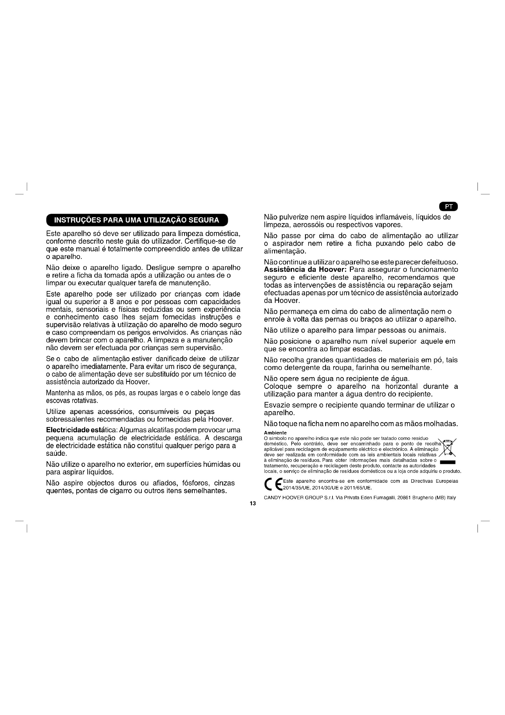 , è consigliato usare le spazzole appropriate per le principali operazioni di pulizia. Queste spazzole sono indicate nel diagramma con le lettere GP, HF o CA. La spazzola di tipo GP è adatta per pulire sia tappeti che pavimenti duri. La spazzola di tipo HF è adatta solo per la pulizia dei pavimenti duri. La spazzola di tipo CA è adatta solo per la pulizia dei tappeti. Le altre spazzole sono accessorie per operazioni di pulizia speciale e sono raccomandate solo per usi occasionali. La bocchetta per fessure, la bocchetta tutti gli usi e la spazzola a pennello possono essere riposte sul tubo. Bocchetta per fessure* – Per angoli e punti difcili da raggiungere. [X1] Spazzola a pennello* – Per librerie, cornici, tastiere e altre superci delicate. [X2] Bocchetta tutti gli usi – Per imbottiti e tessuti. [X3] Spazzola per tappeti e pavimenti**- Per tappeti e pavimenti. [P] Spazzola Parquet* – Per parquet e pavimenti delicati. [AA] Mini turbospazzola per rimuovere i peli di animali domestici*– utilizzare la mini turbospazzola per la pulizia profonda di superci tessili e imbottiti e per altre aree difcili. [Y] Mini turbospazzola per rimuovere gli allergeni* – utilizzare la mini turbospazzola per la pulizia profonda di superci tessili e imbottiti e per altre aree difcili. [Z] IMPORTANTE: Non utilizzare le mini turbo spazzole su tappeti a frange, pellicce o moquette con pelo di oltre 15 mm. Non tenere ferma la spazzola sul tappeto con il rullo in rotazione.13 INSTRUÇÕES PARA UMA UTILIZAÇÃO SEGURA Este aparelho só deve ser utilizado para limpeza doméstica, conforme descrito neste guia do utilizador. Certique-se de que este manual é totalmente compreendido antes de utilizar o aparelho. Não deixe o aparelho ligado. Desligue sempre o aparelho e retire a cha da tomada após a utilização ou antes de o limpar ou executar qualquer tarefa de manutenção. Este aparelho pode ser utilizado por crianças com idade igual ou superior a 8 anos e por pessoas com capacidades mentais, sensoriais e físicas reduzidas ou sem experiência e conhecimento caso lhes sejam fornecidas instruções e supervisão relativas à utilização do aparelho de modo seguro e caso compreendam os perigos envolvidos. As crianças não devem brincar com o aparelho. A limpeza e a manutenção não devem ser efectuada por crianças sem supervisão. Se o cabo de alimentação estiver danicado deixe de utilizar o aparelho imediatamente. Para evitar um risco de segurança, o cabo de alimentação deve ser substituído por um técnico de assistência autorizado da Hoover. Mantenha as mãos, os pés, as roupas largas e o cabelo longe das escovas rotativas. Utilize apenas acessórios, consumíveis ou peças sobressalentes recomendadas ou fornecidas pela Hoover. Electricidade estática: Algumas alcatifas podem provocar uma pequena acumulação de electricidade estática. A descarga de electricidade estática não constitui qualquer perigo para a saúde. Não utilize o aparelho no exterior, em superfícies húmidas ou para aspirar líquidos. Não aspire objectos duros ou aados, fósforos, cinzas quentes, pontas de cigarro ou outros itens semelhantes. Não pulverize nem aspire líquidos inamáveis, líquidos de limpeza, aerossóis ou respectivos vapores. Não passe por cima do cabo de alimentação ao utilizar o a spirador nem retire a cha puxando pelo cabo de alimentação. Não continue a utilizar o aparelho se este parecer defeituoso. Assistência da Hoover: Para assegurar o funcionamento seguro e eciente deste aparelho, recomendamos que todas as intervenções de assistência ou reparação sejam efectuadas apenas por um técnico de assistência autorizado da Hoover. Não permaneça em cima do cabo de alimentação nem o enrole à volta das pernas ou braços ao utilizar o aparelho. Não utilize o aparelho para limpar pessoas ou animais. Não posicione o aparelho num nível superior aquele em que se encontra ao limpar escadas. Não recolha grandes quantidades de materiais em pó, tais como detergente da roupa, farinha ou semelhante. Não opere sem água no recipiente de água. Coloque sempre o aparelho na horizontal durante a utilização para manter a água dentro do recipiente. Esvazie sempre o recipiente quando terminar de utilizar o aparelho. Não toque na cha nem no aparelho com as mãos molhadas. Ambiente O símbolo no aparelho indica que este não pode ser tratado como resíduo doméstico. Pelo contrário, deve ser encaminhado para o ponto de recolha aplicável para reciclagem de equipamento eléctrico e electrónico. A eliminação deve ser realizada em conformidade com as leis ambientais locais relativas à eliminação de resíduos. Para obter informações mais detalhadas sobre o tratamento, recuperação e reciclagem deste produto, contacte as autoridades locais, o serviço de eliminação de resíduos domésticos ou a loja onde adquiriu o produto. Este aparelho encontra-se em conformidade com as Directivas Europeias 2014/35/UE, 2014/30/UE e 2011/65/UE. CANDY HOOVER GROUP S.r.l. Via Privata Eden Fumagalli, 20861 Brugherio (MB) Italy PT14 *Apenas em alguns modelos **Pode variar de acordo com o modelo