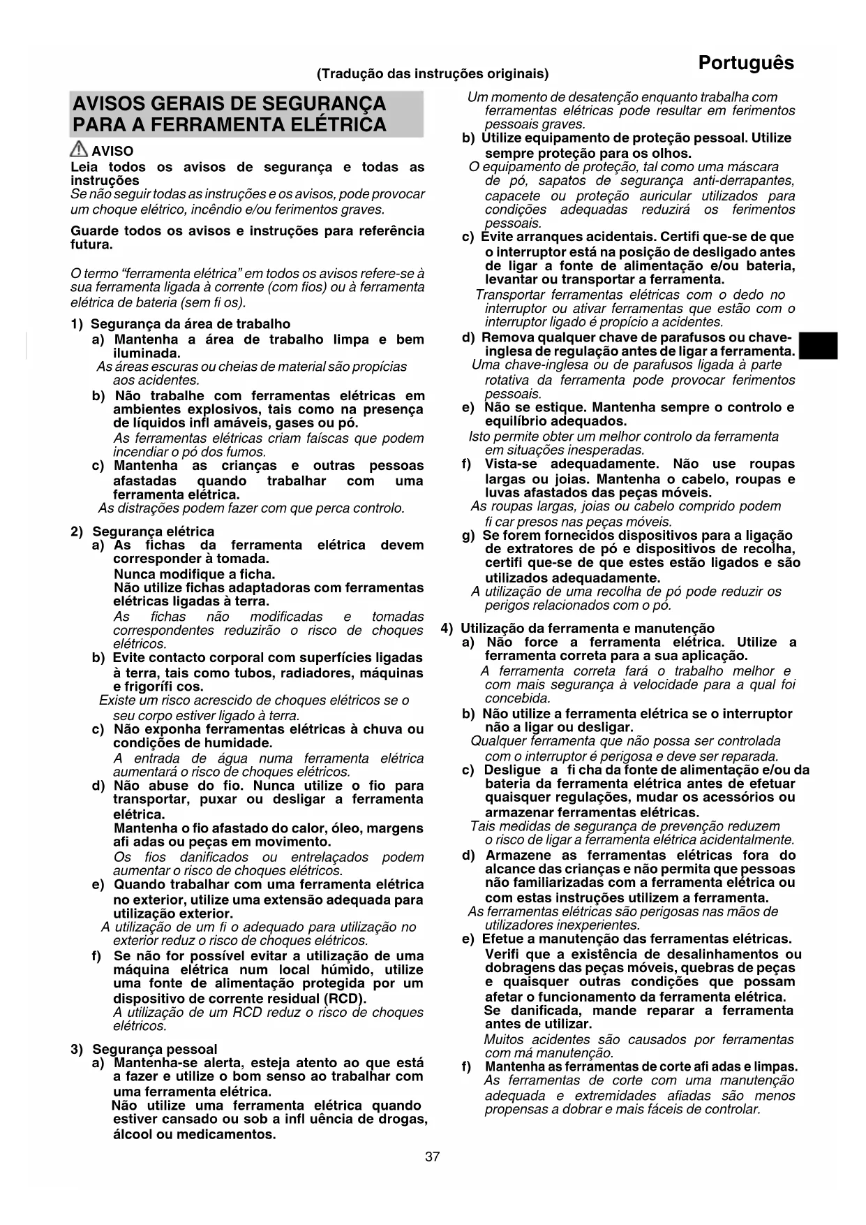 a) Mantenha-se alerta, esteja atento ao que está a fazer e utilize o bom senso ao trabalhar com uma ferramenta elétrica. Não utilize uma ferramenta elétrica quando estiver cansado ou sob a infl uência de drogas, álcool ou medicamentos. (Tradução das instruções originais) 00BookG10SQ2.indb3700BookG10SQ2.indb37 2019/07/0110:00:072019/07/0110:00:0738 Português