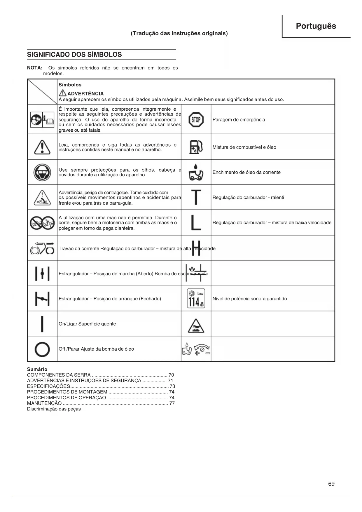 Nível de potência sonora garantido On/Ligar Superfície quente Off /Parar Ajuste da bomba de óleo Sumário