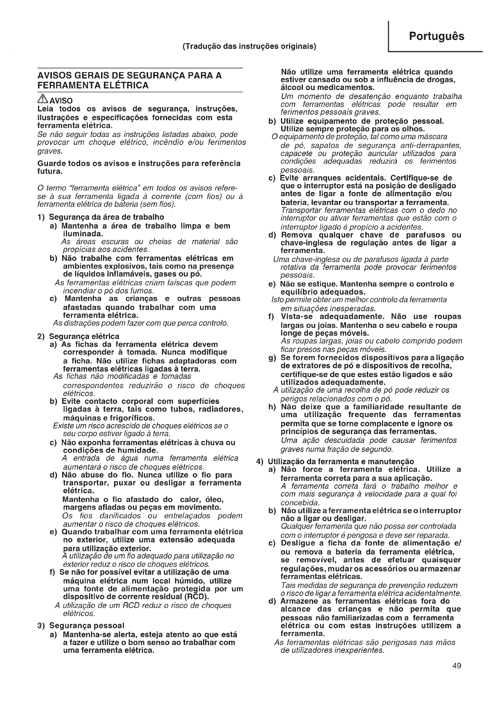 a) Não force a ferramenta elétrica. Utilize a ferramenta correta para a sua aplicação. A ferramenta correta fará o trabalho melhor e com mais segurança à velocidade para a qual foi concebida. b) Não utilize a ferramenta elétrica se o interruptor não a ligar ou desligar. Qualquer ferramenta que não possa ser controlada com o interruptor é perigosa e deve ser reparada. c) Desligue a cha da fonte de alimentação e/ ou remova a bateria da ferramenta elétrica, se removível, antes de efetuar quaisquer regulações, mudar os acessórios ou armazenar ferramentas elétricas. Tais medidas de segurança de prevenção reduzem o risco de ligar a ferramenta elétrica acidentalmente. d) Armazene as ferramentas elétricas fora do alcance das crianças e não permita que pessoas não familiarizadas com a ferramenta elétrica ou com estas instruções utilizem a ferramenta. As ferramentas elétricas são perigosas nas mãos de utilizadores inexperientes. (Tradução das instruções originais) 0000Book_C7UY.indb 49 2019/01/30 9:41:0050 Português e) Efetue a manutenção das ferramentas elétricas e acessórios. Verique a existência de desalinhamentos ou dobragens das peças móveis, quebras de peças e quaisquer outras condições que possam afetar o funcionamento da ferramenta elétrica. Se danicada, mande reparar a ferramenta antes de utilizar. Muitos acidentes são causados por ferramentas com má manutenção. f) Mantenha as ferramentas de corte aadas e limpas. As ferramentas de corte com uma manutenção adequada e extremidades aadas são menos propensas a dobrar e mais fáceis de controlar. g) Utilize a ferramenta elétrica, acessórios e brocas de ferramentas, etc., de acordo com estas instruções, tendo em consideração as condições de trabalho e o trabalho a ser efetuado. A utilização de uma ferramenta elétrica para operações diferentes das previstas pode resultar numa situação perigosa. h) Mantenha as pegas e as superfícies de manuseamento secas, limpas e livres de óleo e graxa. Pegas de manuseamento escorregadias não permitem a manipulação segura e controlo da ferramenta em situações inesperadas.