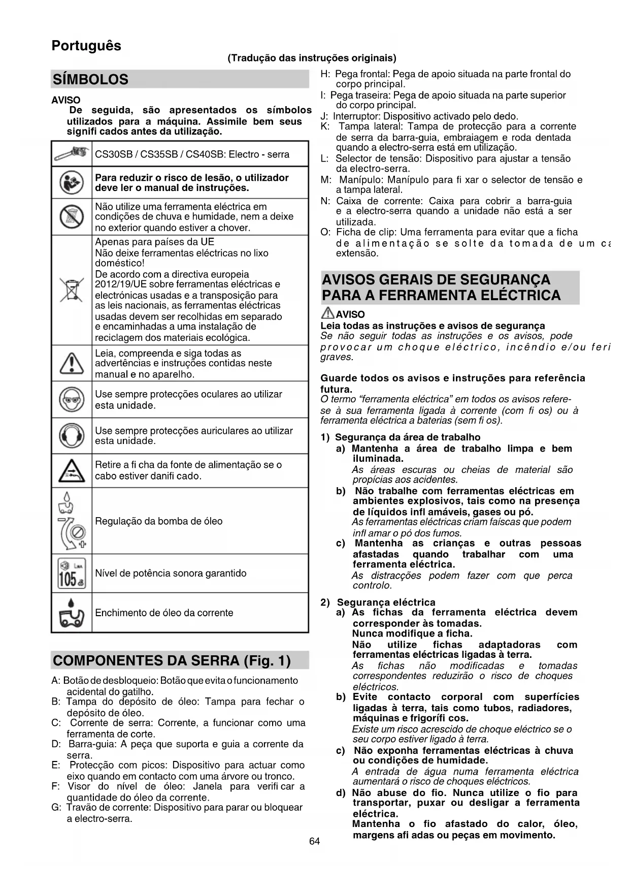 El valor total de vibración declarado ha sido medido de acuerdo con un método de prueba estándar y permite comparar unas herramientas con otras. También resulta útil para llevar a cabo evaluaciones preliminares de exposición. ADVERTENCIA ○ La emisión de vibración durante la utilización de la herramienta eléctrica puede ser diferente del valor total declarado dependiendo de las formas de utilización de la herramienta. ○ Identifi que las medidas seguras para proteger al operario basadas en una estimación de exposición en las condiciones reales de uso (teniendo en cuenta todas las partes del ciclo de funcionamiento como tiempos cuando la herramienta está apagada y cuando funciona lentamente además del tiempo de activación). NOTA Debido al programa continuo de investigación y desarrollo de HiKOKI estas especifi caciones están sujetas a cambio sin previo aviso. 0000BookCS30SB.indb630000BookCS30SB.indb63 2019/06/1410:09:252019/06/1410:09:2564 Português (Tradução das instruções originais) SÍMBOLOS AVISO De seguida, são apresentados os símbolos utilizados para a máquina. Assimile bem seus signifi cados antes da utilização. CS30SB / CS35SB / CS40SB: Electro - serra Para reduzir o risco de lesão, o utilizador deve ler o manual de instruções. Não utilize uma ferramenta eléctrica em condições de chuva e humidade, nem a deixe no exterior quando estiver a chover. Apenas para países da UE Não deixe ferramentas eléctricas no lixo doméstico! De acordo com a directiva europeia 2012/19/UE sobre ferramentas eléctricas e electrónicas usadas e a transposição para as leis nacionais, as ferramentas eléctricas usadas devem ser recolhidas em separado e encaminhadas a uma instalação de reciclagem dos materiais ecológica. Leia, compreenda e siga todas as advertências e instruções contidas neste manual e no aparelho. Use sempre protecções oculares ao utilizar esta unidade. Use sempre protecções auriculares ao utilizar esta unidade. Retire a fi cha da fonte de alimentação se o cabo estiver danifi cado. Regulação da bomba de óleo Nível de potência sonora garantido Enchimento de óleo da corrente COMPONENTES DA SERRA (Fig. 1) A: Botão de desbloqueio: Botão que evita o funcionamento acidental do gatilho. B: Tampa do depósito de óleo: Tampa para fechar o depósito de óleo. C: Corrente de serra: Corrente, a funcionar como uma ferramenta de corte. D: Barra-guia: A peça que suporta e guia a corrente da serra. E: Protecção com picos: Dispositivo para actuar como eixo quando em contacto com uma árvore ou tronco. F: Visor do nível de óleo: Janela para verifi car a quantidade do óleo da corrente. G: Travão de corrente: Dispositivo para parar ou bloquear a electro-serra. H: Pega frontal: Pega de apoio situada na parte frontal do corpo principal. I: Pega traseira: Pega de apoio situada na parte superior do corpo principal. J: Interruptor: Dispositivo activado pelo dedo. K: Tampa lateral: Tampa de protecção para a corrente de serra da barra-guia, embraiagem e roda dentada quando a electro-serra está em utilização. L: Selector de tensão: Dispositivo para ajustar a tensão da electro-serra. M: Manípulo: Manípulo para fi xar o selector de tensão e a tampa lateral. N: Caixa de corrente: Caixa para cobrir a barra-guia e a electro-serra quando a unidade não está a ser utilizada. O: Ficha de clip: Uma ferramenta para evitar que a fi cha de alimentação se solte da tomada de um cabo de extensão.