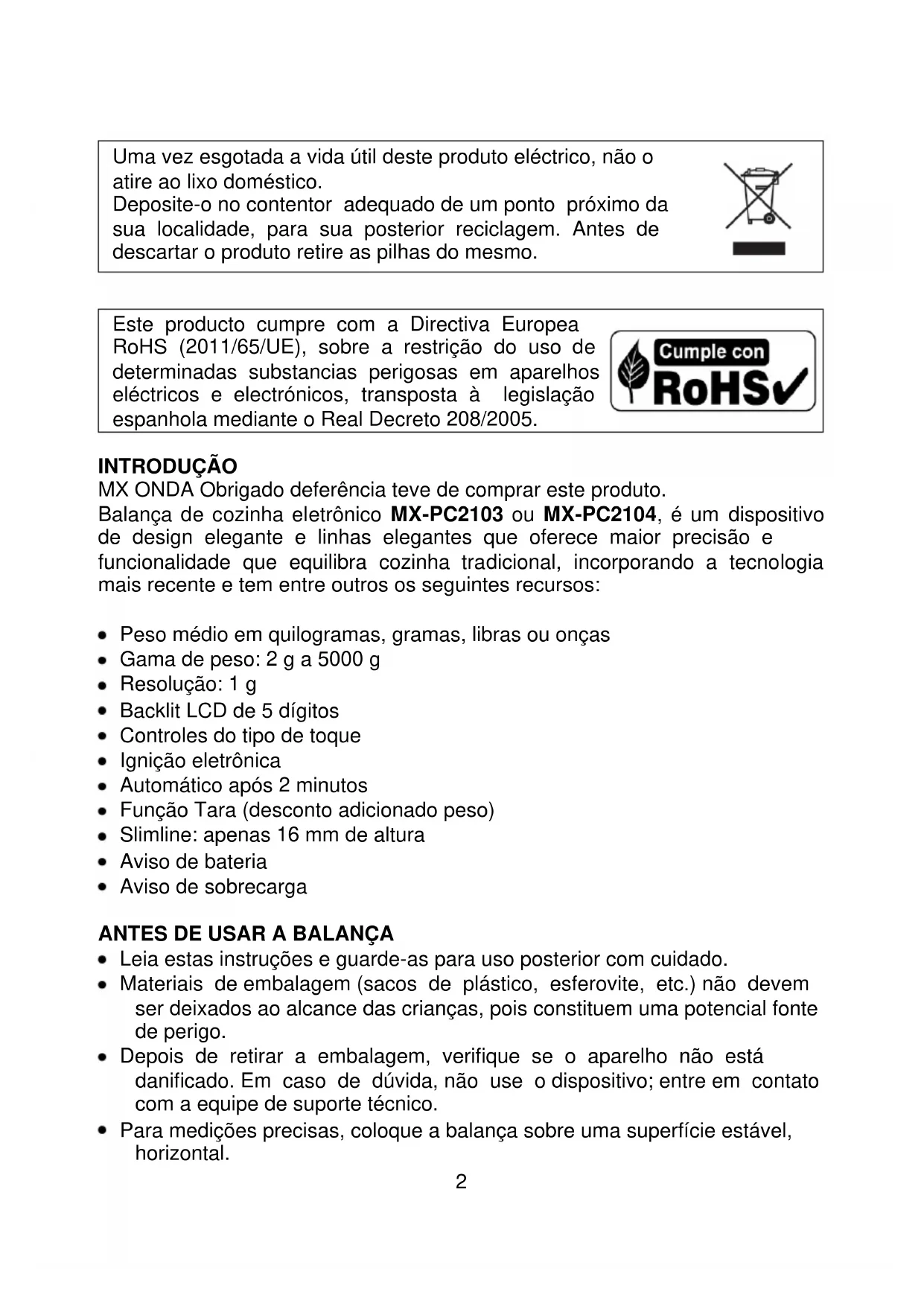 Este producto cumpre com a Directiva Europea RoHS (2011/65/UE), sobre a restrição do uso de determinadas substancias perigosas em aparelhos eléctricos e electrónicos, transposta à legislação espanhola mediante o Real Decreto 208/2005. INTRODUÇÃO MX ONDA Obrigado deferência teve de comprar este produto. Balança de cozinha eletrônico MX-PC2103 ou MX-PC2104, é um dispositivo de design elegante e linhas elegantes que oferece maior precisão e funcionalidade que equilibra cozinha tradicional, incorporando a tecnologia mais recente e tem entre outros os seguintes recursos: Peso médio em quilogramas, gramas, libras ou onças Gama de peso: 2 g a 5000 g Resolução: 1 g Backlit LCD de 5 dígitos Controles do tipo de toque Ignição eletrônica Automático após 2 minutos Função Tara (desconto adicionado peso) Slimline: apenas 16 mm de altura Aviso de bateria Aviso de sobrecarga