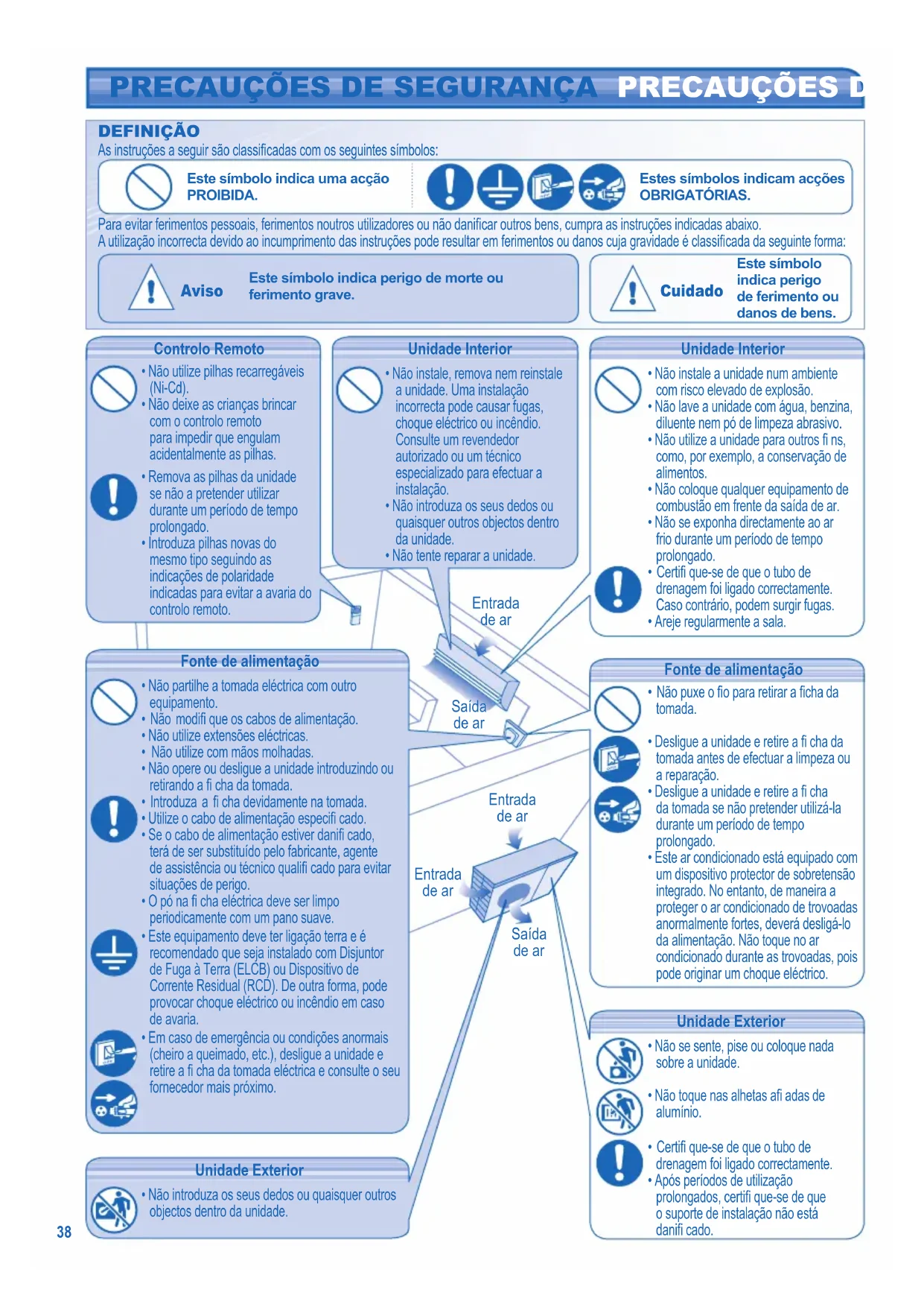 - Areje regularmente a sala. DEFINIÇÃO As instruções a seguir são classifi cadas com os seguintes símbolos: Este símbolo indica uma acção PROIBIDA. Estes símbolos indicam acções OBRIGATÓRIAS. Para evitar ferimentos pessoais, ferimentos noutros utilizadores ou não danifi car outros bens, cumpra as instruções indicadas abaixo. A utilização incorrecta devido ao incumprimento das instruções pode resultar em ferimentos ou danos cuja gravidade é classifi cada da seguinte forma: Aviso Este símbolo indica perigo de morte ou ferimento grave. Cuidado Este símbolo indica perigo de ferimento ou danos de bens. Controlo Remoto