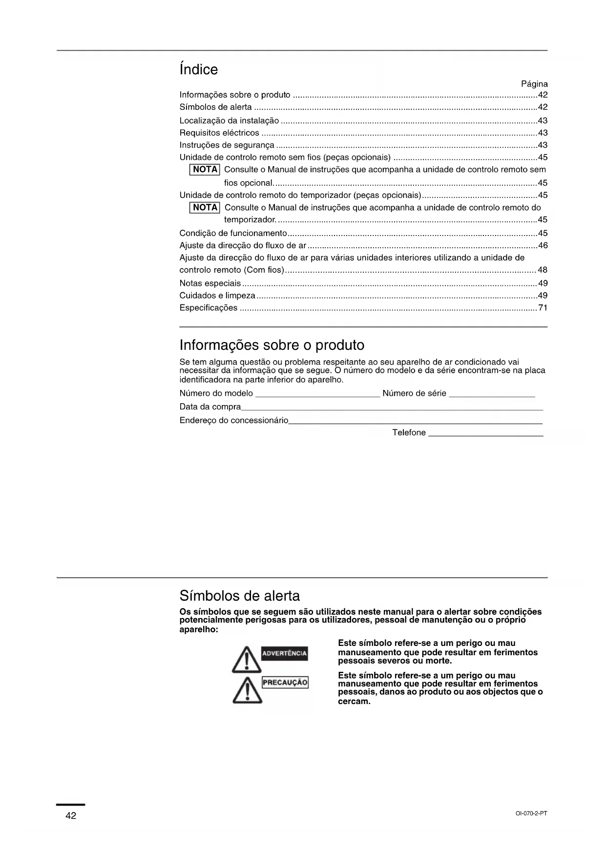 - MANUAL DE INSTRUÇÕES Este ar condicionado utiliza o novo refrigerante R410A. OI-070-1-PT 05_85464609070013_PT_Cover.fm Page 41 Thursday, February 3, 2011 3:22 PM42 Índice Página Informações sobre o produto ......................................................................................................42 Símbolos de alerta ......................................................................................................................42 Localização da instalação ...........................................................................................................43 Requisitos eléctricos ...................................................................................................................43 Instruções de segurança.............................................................................................................43 Unidade de controlo remoto sem fios (peças opcionais) ............................................................45 NOTA Consulte o Manual de instruções que acompanha a unidade de controlo remoto sem fios opcional..............................................................................................................45 Unidade de controlo remoto do temporizador (peças opcionais)................................................45 NOTA Consulte o Manual de instruções que acompanha a unidade de controlo remoto do temporizador.............................................................................................................45 Condição de funcionamento........................................................................................................45 Ajuste da direcção do fluxo de ar................................................................................................46 Ajuste da direcção do fluxo de ar para várias unidades interiores utilizando a unidade de controlo remoto (Com fios)..................................................................................................... 48 Notas especiais...........................................................................................................................49 Cuidados e limpeza.....................................................................................................................49 Especificações ............................................................................................................................71 Informações sobre o produto Se tem alguma questão ou problema respeitante ao seu aparelho de ar condicionado vai necessitar da informação que se segue. O número do modelo e da série encontram-se na placa identificadora na parte inferior do aparelho. Número do modelo __________________________ Número de série __________________ Data da compra_______________________________________________________________ Endereço do concessionário_____________________________________________________ Telefone ________________________ Símbolos de alerta Os símbolos que se seguem são utilizados neste manual para o alertar sobre condições potencialmente perigosas para os utilizadores, pessoal de manutenção ou o próprio aparelho: Este símbolo refere-se a um perigo ou mau manuseamento que pode resultar em ferimentos pessoais severos ou morte. Este símbolo refere-se a um perigo ou mau manuseamento que pode resultar em ferimentos pessoais, danos ao produto ou aos objectos que o cercam. OI-070-2-PT 05_85464609070013_PT.fm Page 42 Thursday, February 3, 2011 3:22 PM43 Localização da instalação