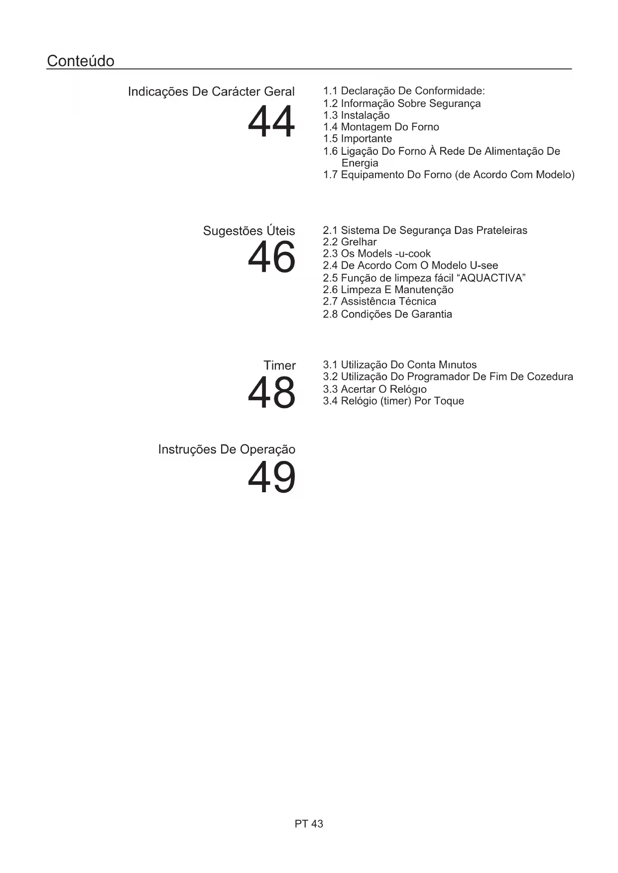 Obrigado por ter optado por um dos nossos produtos. Para tirar o maior proveito possível do seu forno, recomendamos que: Leia atentamente este manual de instruções de utilização; ele contém instruções importantes sobre a instalação, a utilização e a manutenção seguras deste forno. Mantenha este manual de instruções à mão, num local seguro, para o poder consultar sempre que necessário. Quando o forno for ligado pela primeira vez, ele poderá emitir fumo com um cheiro acre. Isto fica a dever-se ao facto de o agente aglutinante dos painéis de isolamento existentes à volta do forno ter sido aquecido pela primeira vez. Trata-se de um facto absolutamente normal; se ele ocorrer, terá apenas de esperar que o fumo se dissipe antes de introduzir os alimentos no forno. Devido à sua natureza, um forno aquece muito, em especial a sua porta de vidro. PT 44 AVISO: Durante a sua utilização, tanto o aparelho, como os componentes acessíveis do mesmo ficam muito quentes. Evite sempre tocar nos elementos de aquecimento.