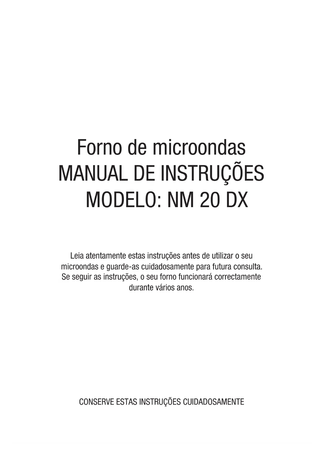 MODELO: NM 20 DXPPRECAUÇÕES A TER EM CONTA PARA EVITAR UMA POSSÍVEL EXPOSIÇÃO A ENERGIA EXCESSIVA DO MICROONDAS a) Não tente colocar este microondas em funcionamento com a porta aberta, uma vez que pode resultar numa exposição nociva à energia de microondas. É importante não forçar ou alterar os dispositivos de bloqueios de segurança. b) Não introduza qualquer objecto entre a face frontal e a porta do forno nem deixe que se acumule sujidade ou resíduos de produtos de limpeza nas superfícies de vedação. c) AVISO: Se a porta ou as vedações da porta estiverem danifi cadas, o forno não deve ser colocado em funcionamento até que os danos sejam reparados por um técnico qualifi cado. ADENDA Se não for mantida a limpeza do aparelho, a superfície pode fi car danifi cada, o que pode afectar a vida útil do aparelho e criar uma situação de risco. Especifi cações