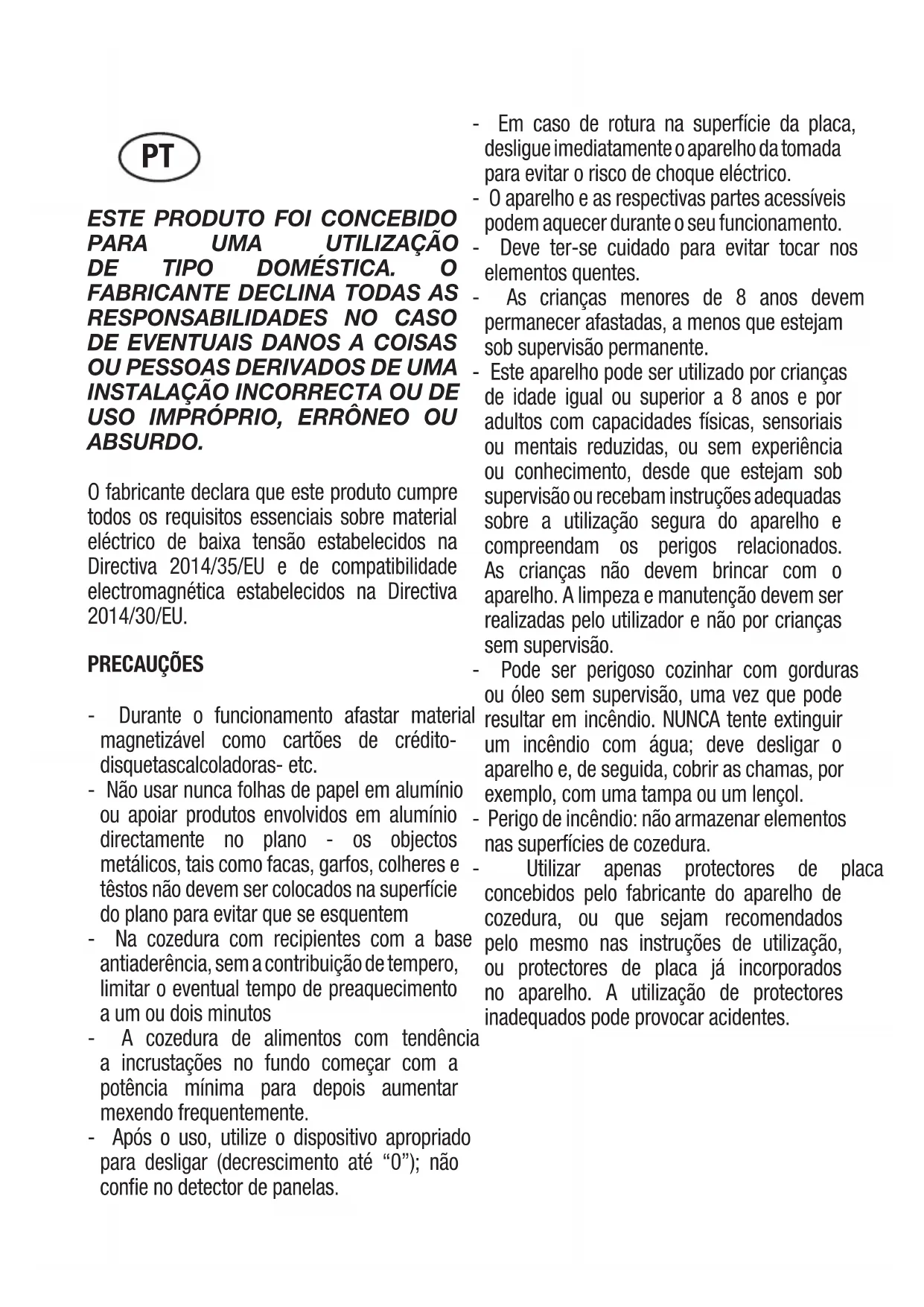 ABSURDO. O fabricante declara que este produto cumpre todos os requisitos essenciais sobre material eléctrico de baixa tensão estabelecidos na Directiva 2014/35/EU e de compatibilidade electromagnética estabelecidos na Directiva 2014/30/EU. PRECAUÇÕES - Durante o funcionamento afastar material magnetizável como cartões de crédito- disquetascalcoladoras- etc. - Não usar nunca folhas de papel em alumínio ou apoiar produtos envolvidos em alumínio directamente no plano - os objectos metálicos, tais como facas, garfos, colheres e têstos não devem ser colocados na superfície do plano para evitar que se esquentem - Na cozedura com recipientes com a base antiaderência, sem a contribuição de tempero, limitar o eventual tempo de preaquecimento a um ou dois minutos - A cozedura de alimentos com tendência a incrustações no fundo começar com a potência mínima para depois aumentar mexendo frequentemente. - Após o uso, utilize o dispositivo apropriado para desligar (decrescimento até “0”); não confie no detector de panelas. - Em caso de rotura na superfície da placa, desligue imediatamente o aparelho da tomada para evitar o risco de choque eléctrico. - O aparelho e as respectivas partes acessíveis podem aquecer durante o seu funcionamento. - Deve ter-se cuidado para evitar tocar nos elementos quentes. - As crianças menores de 8 anos devem permanecer afastadas, a menos que estejam sob supervisão permanente. - Este aparelho pode ser utilizado por crianças de idade igual ou superior a 8 anos e por adultos com capacidades físicas, sensoriais ou mentais reduzidas, ou sem experiência ou conhecimento, desde que estejam sob supervisão ou recebam instruções adequadas sobre a utilização segura do aparelho e compreendam os perigos relacionados. As crianças não devem brincar com o aparelho. A limpeza e manutenção devem ser realizadas pelo utilizador e não por crianças sem supervisão. - Pode ser perigoso cozinhar com gorduras ou óleo sem supervisão, uma vez que pode resultar em incêndio. NUNCA tente extinguir um incêndio com água; deve desligar o aparelho e, de seguida, cobrir as chamas, por exemplo, com uma tampa ou um lençol. - Perigo de incêndio: não armazenar elementos nas superfícies de cozedura. - Utilizar apenas protectores de placa concebidos pelo fabricante do aparelho de cozedura, ou que sejam recomendados pelo mesmo nas instruções de utilização, ou protectores de placa já incorporados no aparelho. A utilização de protectores inadequados pode provocar acidentes. PTIntroduzir na cablagem fixa uma forma de desligar da fonte de alimentação com uma separação de contacto em todos os pólos que permitem desligar totalmente conforme as condições de categoria III de sobretensão, de acordo com as regras de ligação. A tomada ou o interruptor onipolar deverão ser posicionados para uma fácil manipulação do aparelho instalado. Este aparelho não está preparado para poder funcionar por meio de um temporizador externo ou sistema de controlo remoto separado. O construtor declina qualquer responsabilidade no caso que não tenham sido respeitadas to- das as disposições aqui em cima, assim como as normas para a prevenção de acidentes. Se o cabo de alimentação estiver danificado, deve ser substituído pelo fabricante ou pelo serviço de assistência técnica ou, em todo o caso, por uma pessoa qualificada, de modo a prevenir qualquer perigo. PRINCÍPIO DE FUNCIONAMENTO (Fig. 1) É baseado nas propriedades electromagnéticas da maior parte dos recipientes para a cozedura. O circuito electrónico administra o funcionamento da bobina (indutor) que cria um campo magnético. O calor é transmitido pelo próprio recipiente ao alimento. A cozedura acontece com descrito abaixo. - mínima dispersão (alto rendimento) - o retiro da panela (basta só a elevação) provoca automaticamente a paragem do sistema - o sistema electrónico permite a máxima flexibilidade e delicadeza de regulação. (Fig. 1) 1 Recipiente 2 Corrente induzida 3 Campo magnético 4 Indutor 5 Circuito electrónico 6 Alimentação eléctrica Instruções para o utilizador (Fig. 2) 1 Ligar/desligar ON / OFF 2 Slider 3 Power 4 Bloqueio 5 LED on/off 6 LED slider 7 LED bloqueio 8 Zona de cozedura 9 LED timer 10 Timer Instalação Todas as operações relativas à instalação (conexão eléctrica) terão de ser efectuadas por pessoal qualificado, segundo as normas em vigor. Para instruções específicas, veja-se a parte reservada para o técnico instalador. Funcionalidade de Cursor TC Cursor: a tecnologia de sensor do novo Cursor TC permite uma regulação dos níveis de cocção (1 – 9) bem como do valor do temporizador (1-99) tocando e deslizando o dedo sobre a área designada. Deslizando para a direita está a aumentar e deslizando para a esquerda está a reduzir o respectivo valor. Além disso, também é possível uma selecção directa do valor pretendido sobre a área do cursor. Touch Control ON/OFF (ligar/desligar) Após a ligação à corrente eléctrica, a unidade TC demora 1 segundo a preparar-se para o funcionamento. Depois de uma reinicialização, todos os visores e LEDs piscam durante 1 segundo. Após 1 segundo, todos os visores e LEDs desligam-se novamente. A unidade TC pode ser agora ligada premindo o botão ON/OFF (ligar/desligar). O visor apresenta de forma constante “0“. Os possíveis avisos ópticos para as zonas de cocção quentes [H] são apresentados em alternância com [0] e o ponto de apresentaçãosincronicamente. Os pontos de apresentação nos visores da superfície de cocção piscam a cada segundo (0,5 seg desligado, 0,5 seg ligado). O sistema electrónico permanece activado durante 20 segundos. Se não houver nenhuma selecção do nível de cocção ou do temporizador durante este período, o sistema electrónico restaura automaticamente para o modo OFF (desligado) emitindo um sinal sonoro. TC só pode ser ligado premindo a tecla de alimentaçã