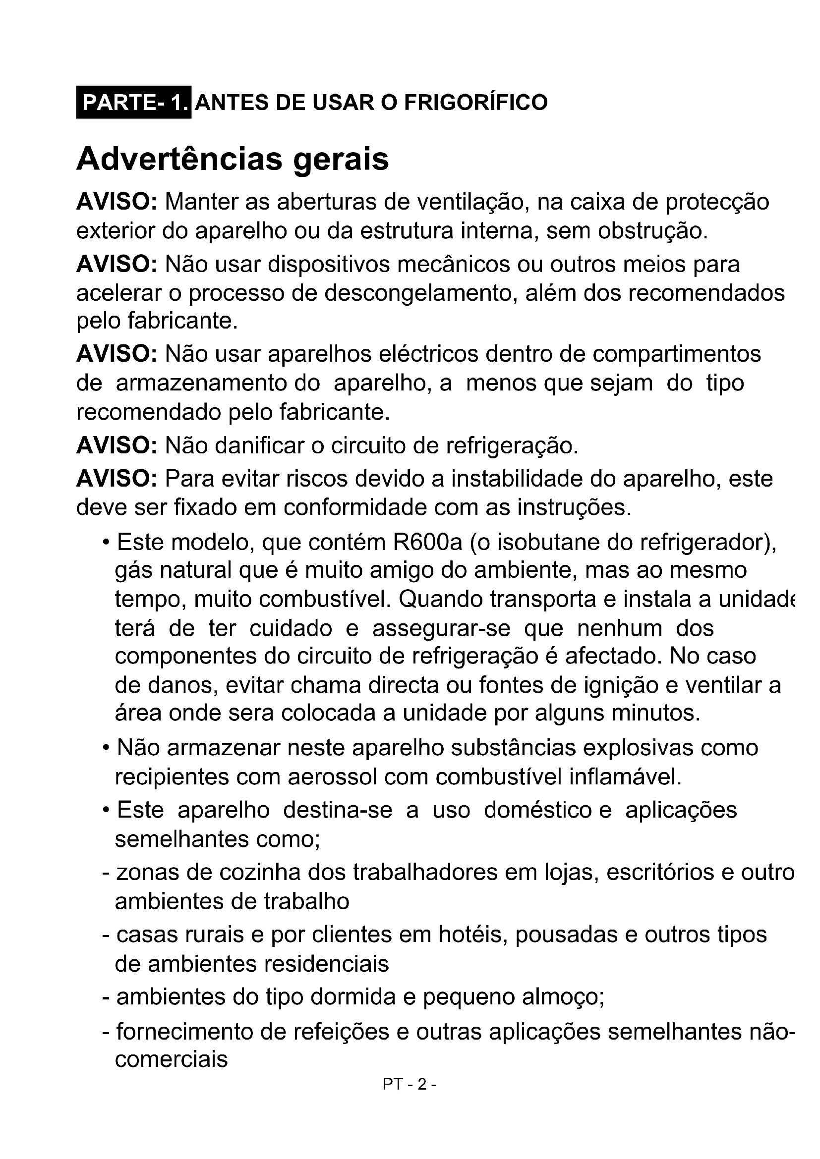 - DESCRIÇÃO GERAL DO APARELHO PT - 2 - PARTE- 1. ANTES DE USAR O FRIGORÍFICO Advertências gerais AVISO: Manter as aberturas de ventilação, na caixa de protecção exterior do aparelho ou da estrutura interna, sem obstrução. AVISO: Não usar dispositivos mecânicos ou outros meios para acelerar o processo de descongelamento, além dos recomendados pelo fabricante. AVISO: Não usar aparelhos eléctricos dentro de compartimentos de armazenamento do aparelho, a menos que sejam do tipo recomendado pelo fabricante. AVISO: Não danificar o circuito de refrigeração. AVISO: Para evitar riscos devido a instabilidade do aparelho, este deve ser fixado em conformidade com as instruções. p. 19